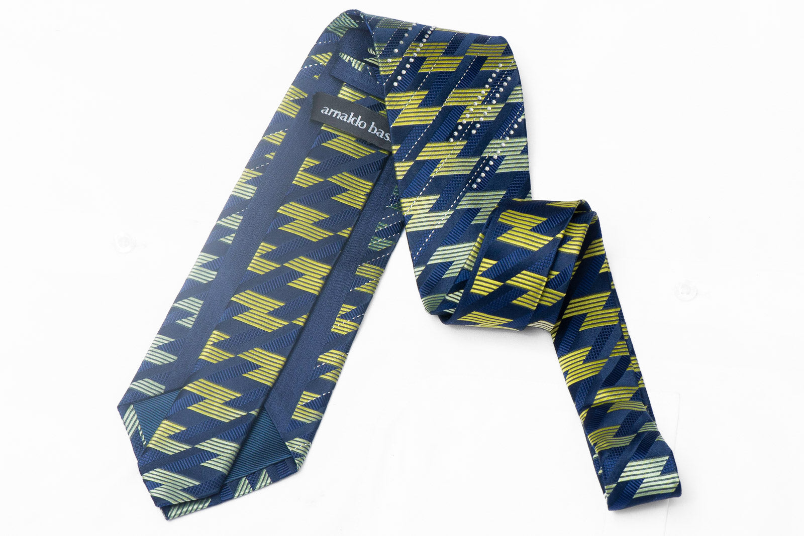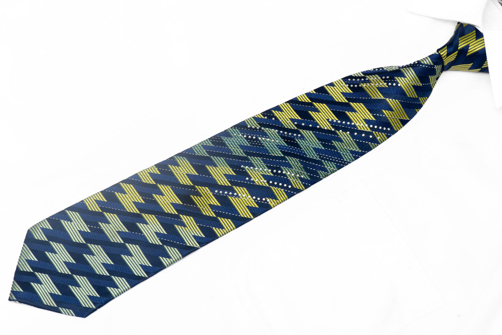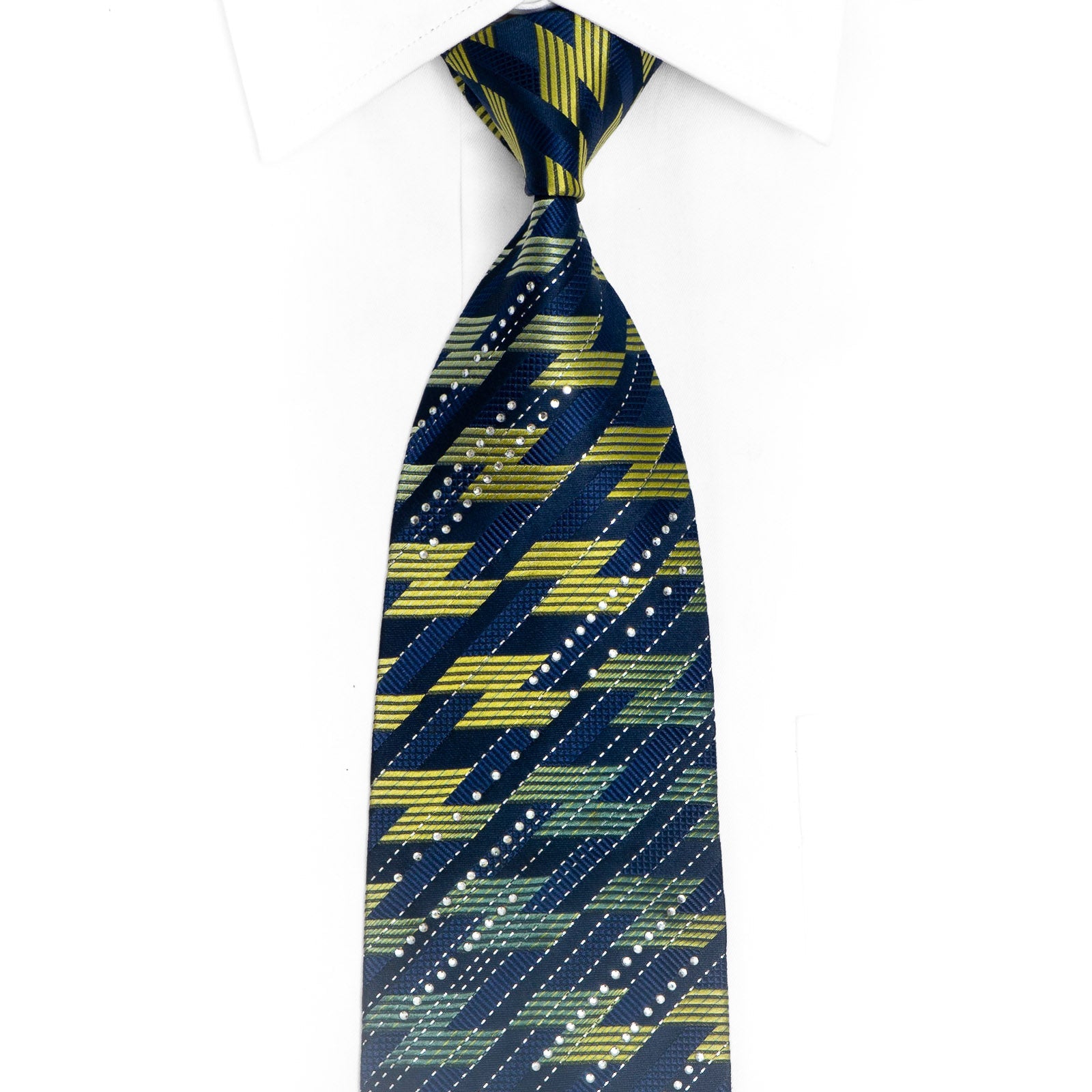 Add a pop of color to your wardrobe with our Green Geometric On Navy Blue Rhinestone Silk Tie With Silver Sparkles. The perfect blend of sophistication and sparkle, this tie will elevate any outfit.