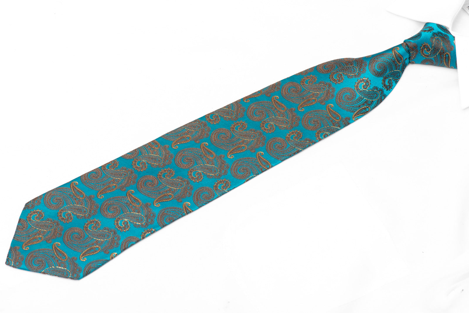 Mens Silk Necktie Brown Paisley On Turquoise With Gold