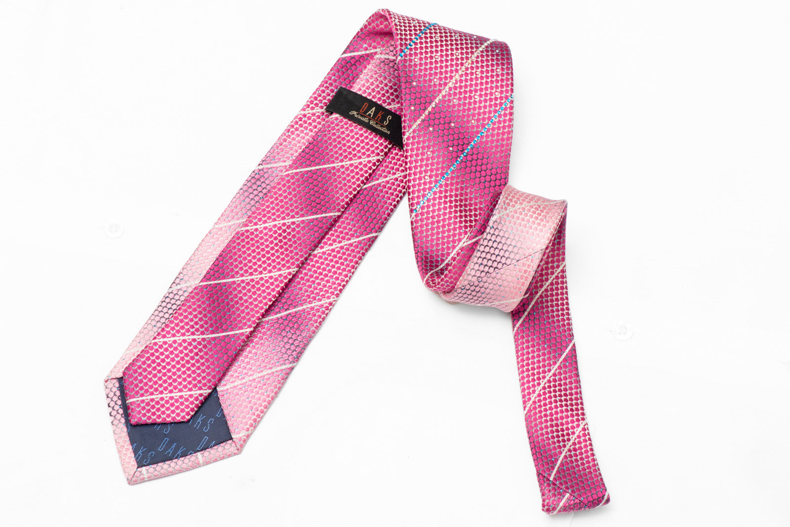 Pink Geometric & Striped Rhinestones On Silver Silk Necktie With Blue Sparkles
