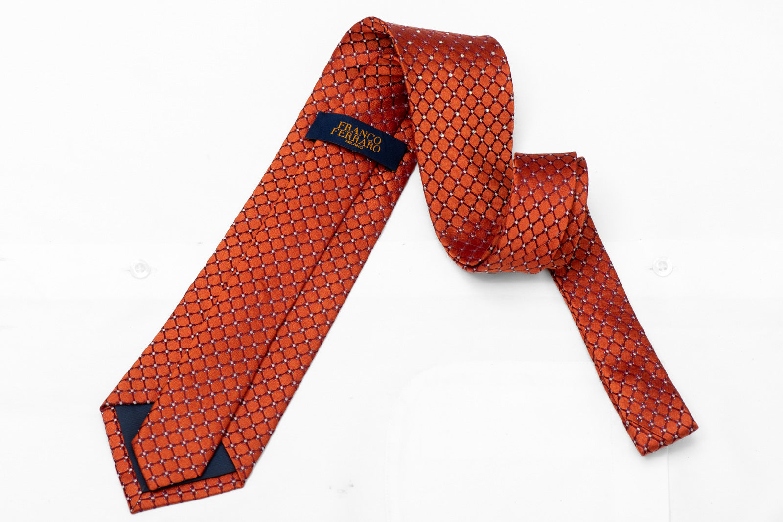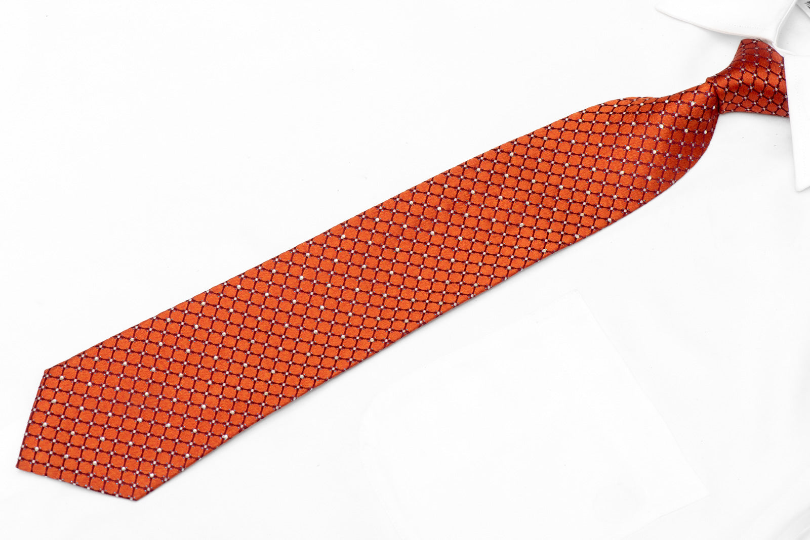 Shine with confidence in this luxurious silk tie that showcases a striking burgundy trellis design against a warm orange canvas. Adorned with glittering rhinestones and brilliant blue sparkles, it's a showstopper that celebrates your unique style. The premium silk fabric offers a refined feel and graceful movement, making it ideal for weddings, galas, or any occasion where you want to make an impression. This tie empowers you to express yourself boldly while maintaining timeless elegance.