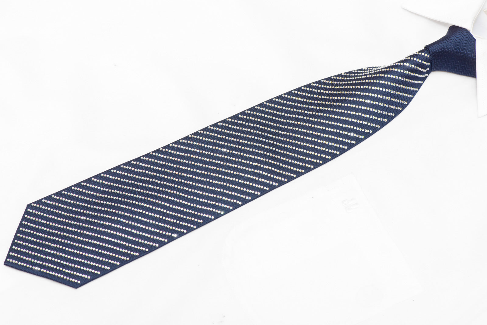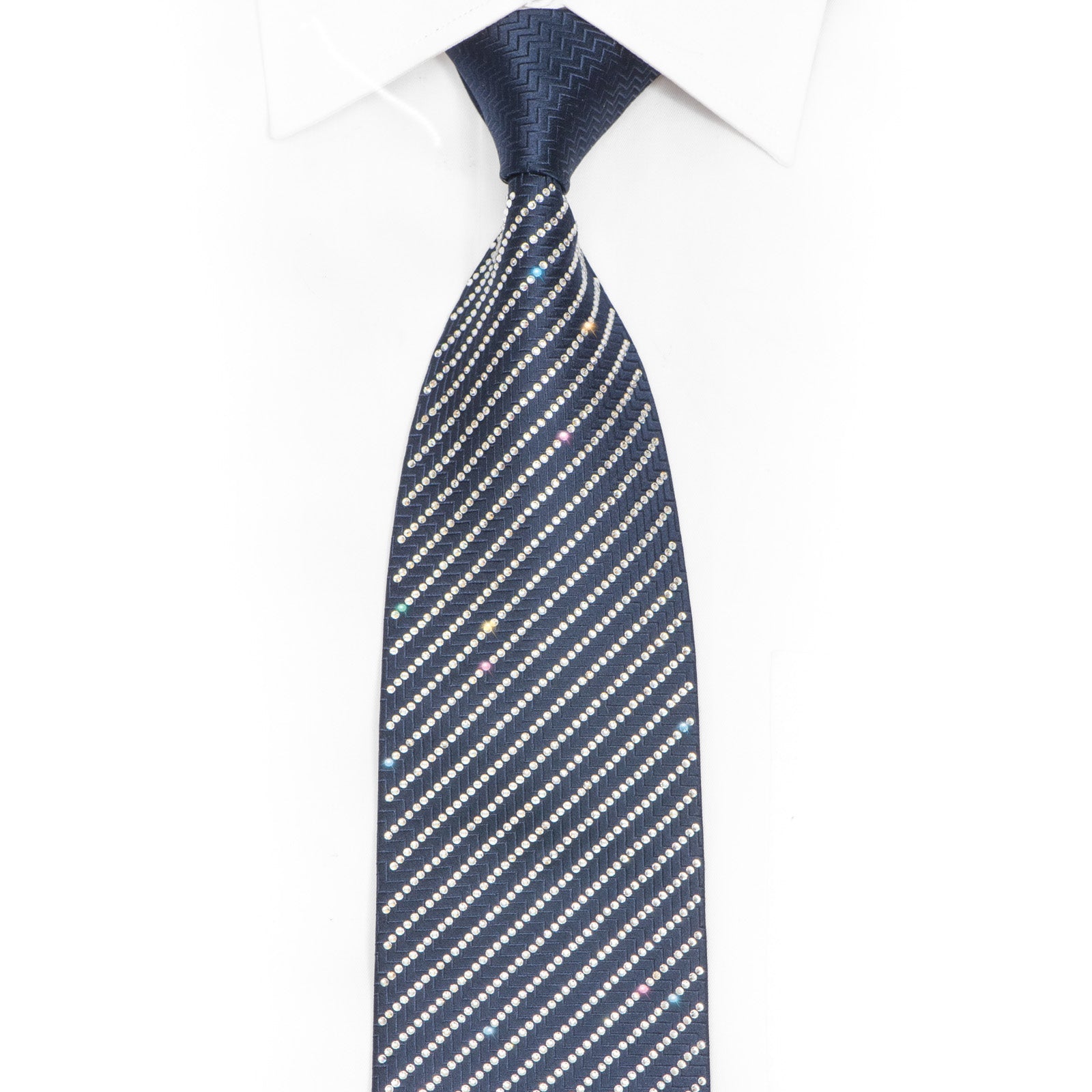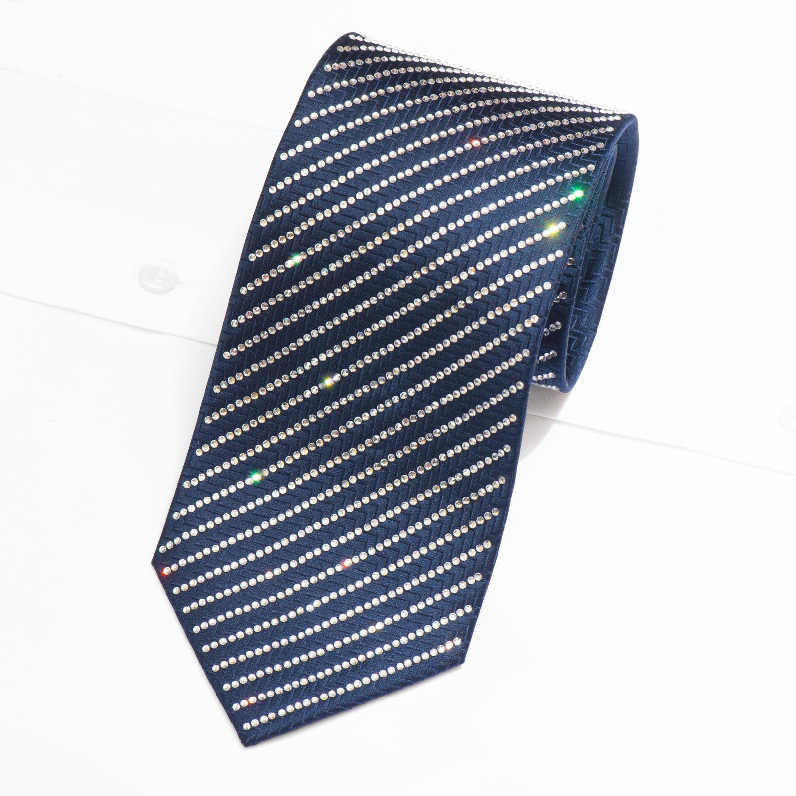 This statement necktie bridges the gap between classic sophistication and contemporary glamour. The navy foundation ensures versatility with formal attire, while the rhinestone embellishment adds a distinctive edge that sets you apart. Ideal for performers, entertainers, wedding parties, or anyone who appreciates exceptional accessories.