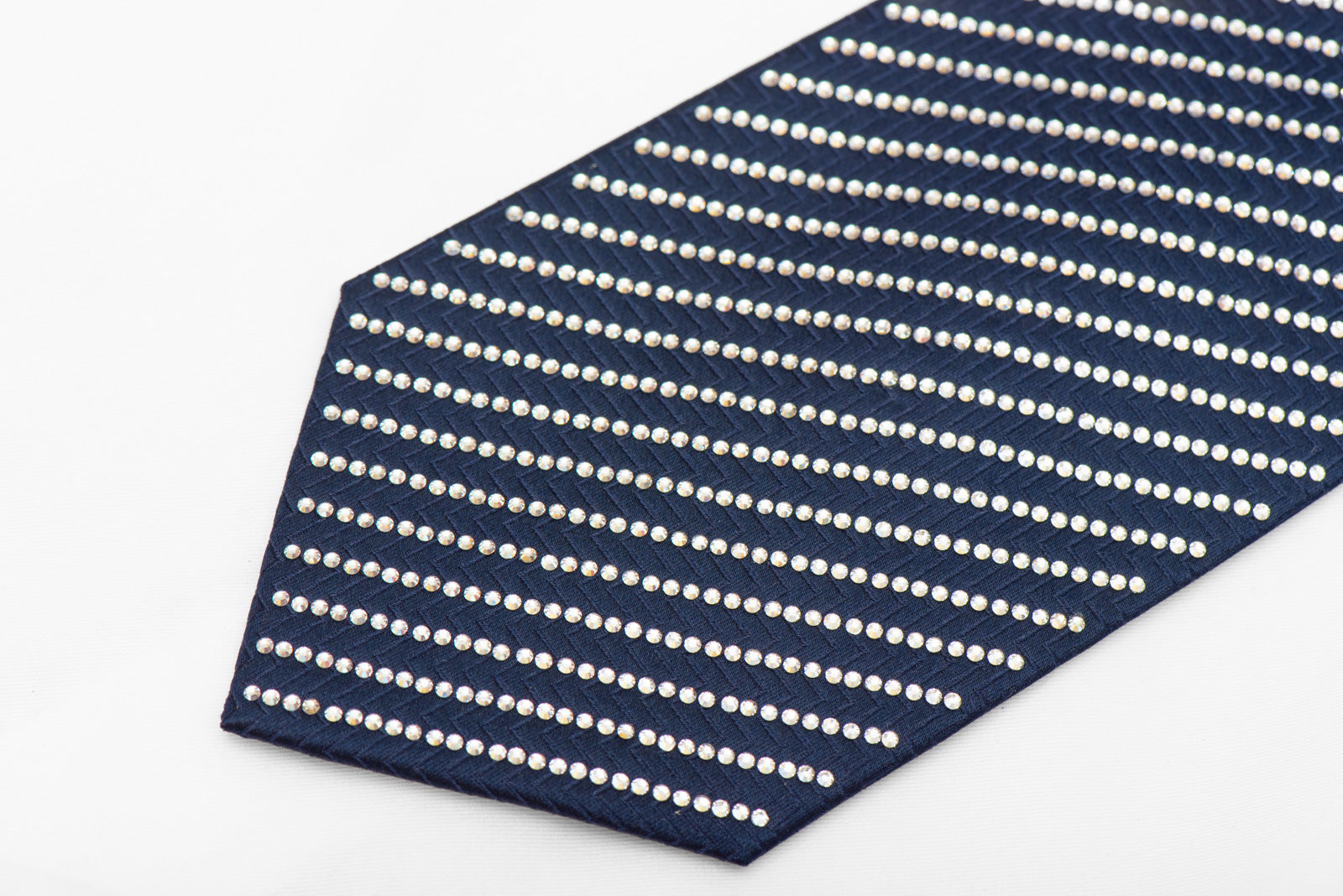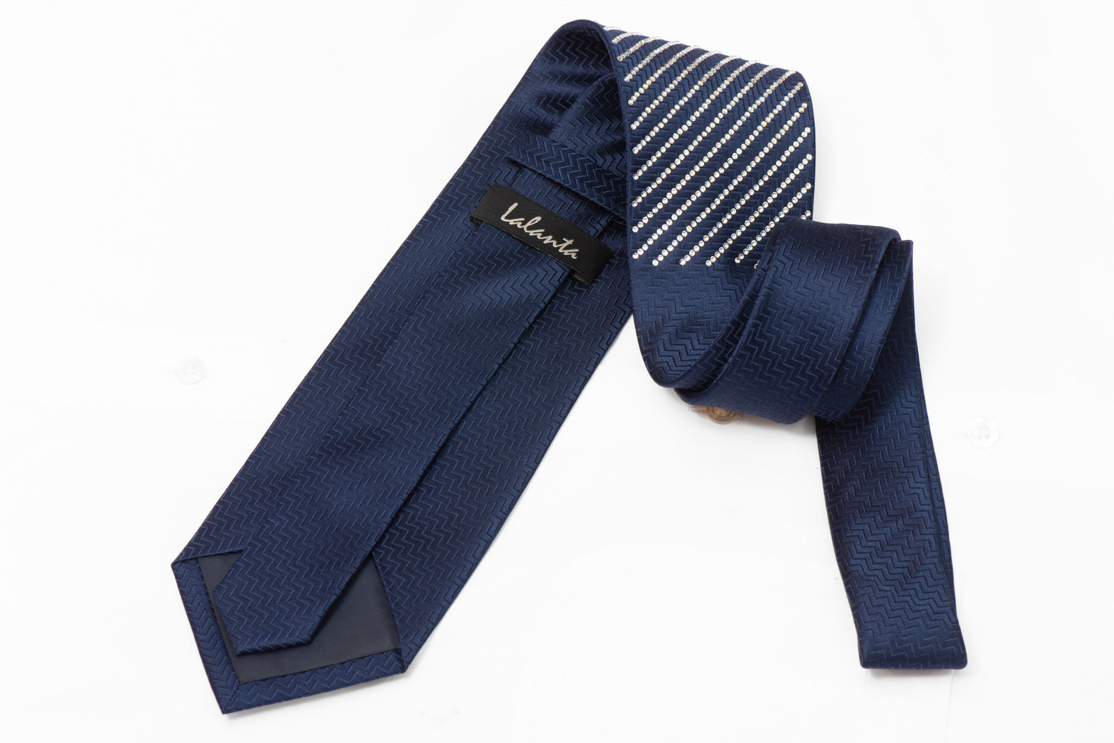 Each rhinestone is individually placed in diagonal striped rows across the rich navy silk, creating a mesmerizing pattern that catches and reflects light with every movement. The herringbone-textured reverse side features the signature Lalanta label, showcasing the attention to detail that defines luxury neckwear.