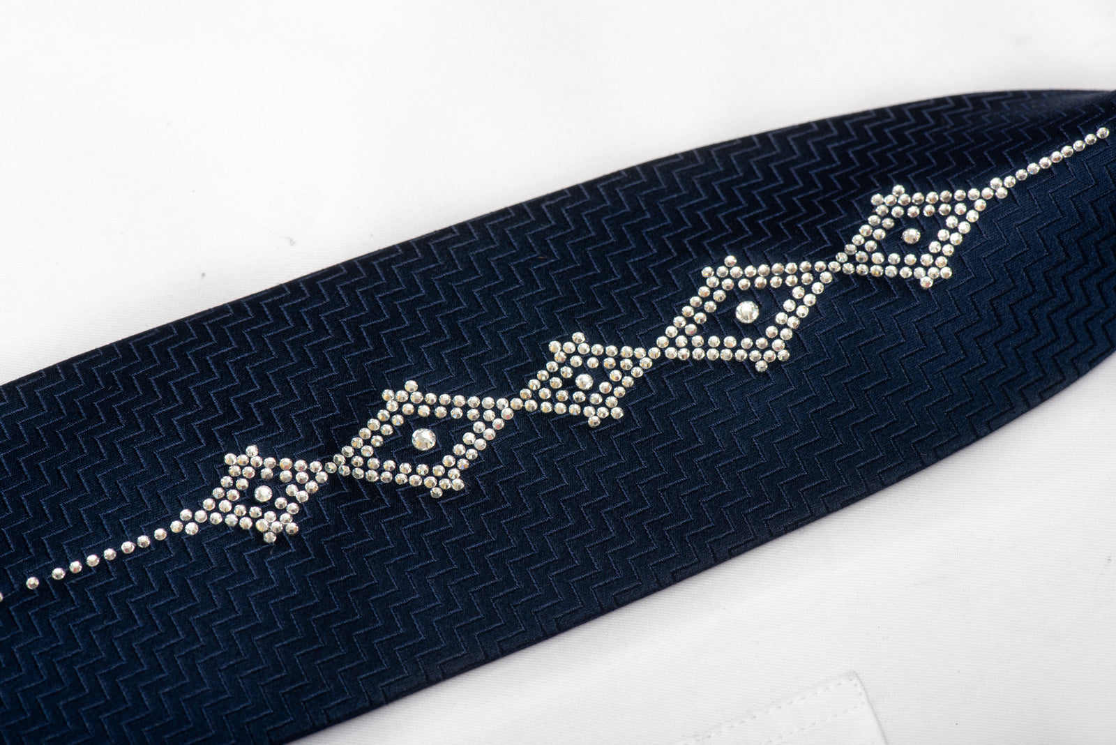 The deep navy base provides a versatile foundation for any formal ensemble, while the precisely arranged rhinestone diamonds create a subtle statement of refined elegance. Each crystal catches the light beautifully, offering just the right amount of sparkle without overwhelming the sophisticated silhouette.