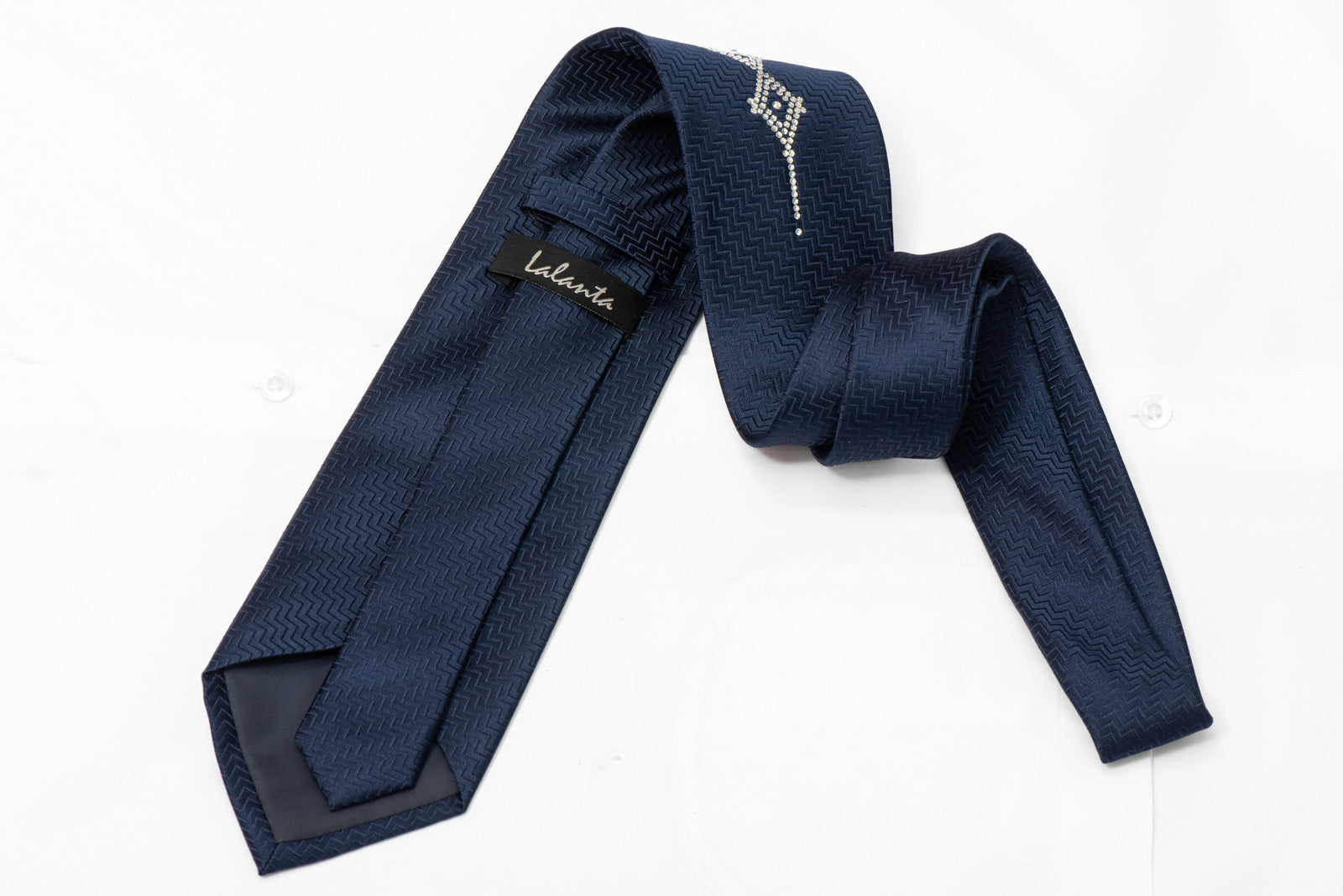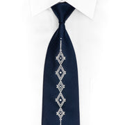 Elevate your formal wardrobe with this exquisite navy blue woven silk necktie from Lalanta. Crafted from premium silk with a sophisticated herringbone weave, this tie features a striking vertical column of geometric rhinestone embellishments that adds contemporary luxury to classic tailoring.
