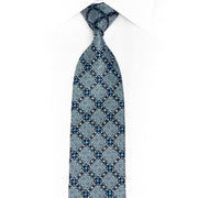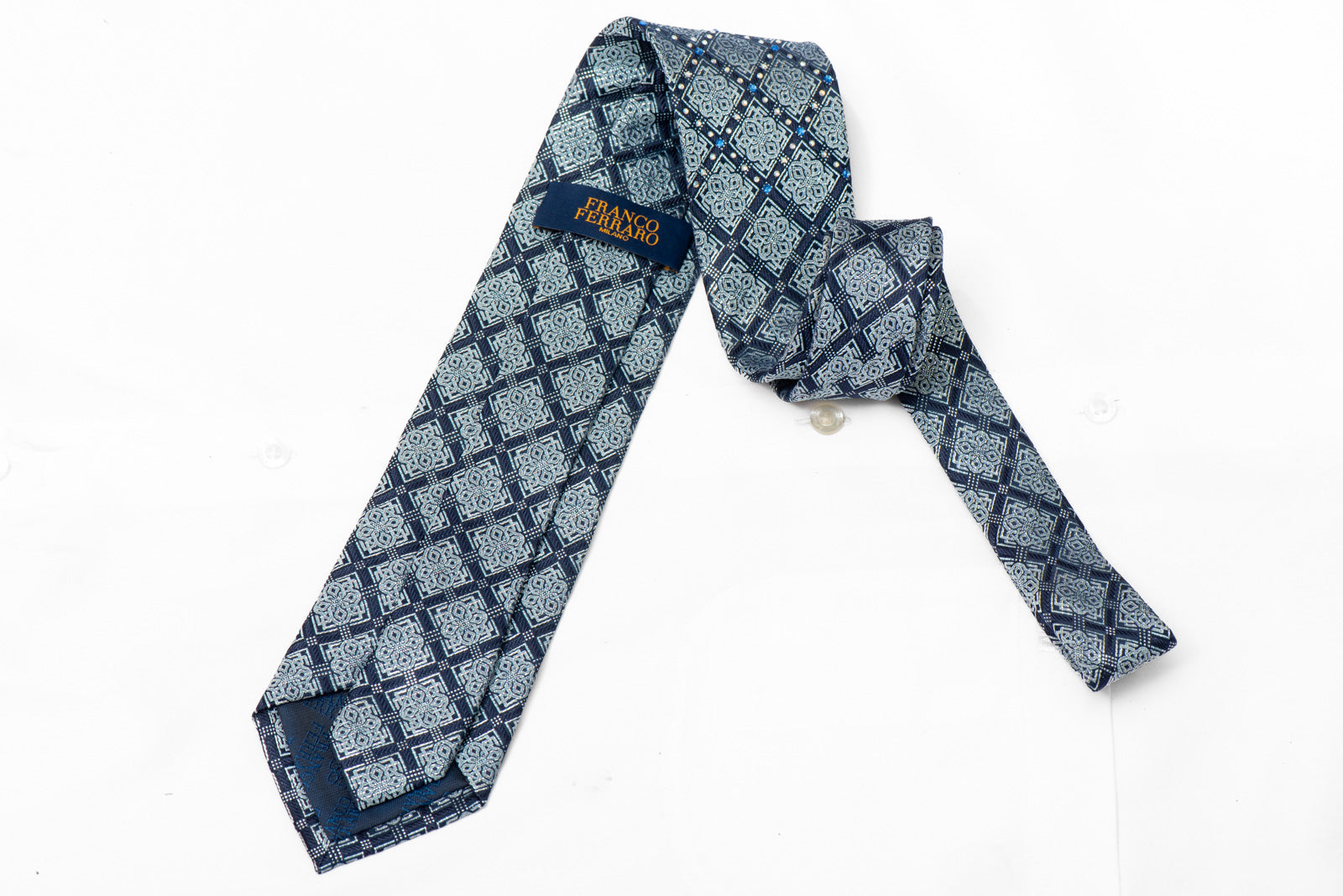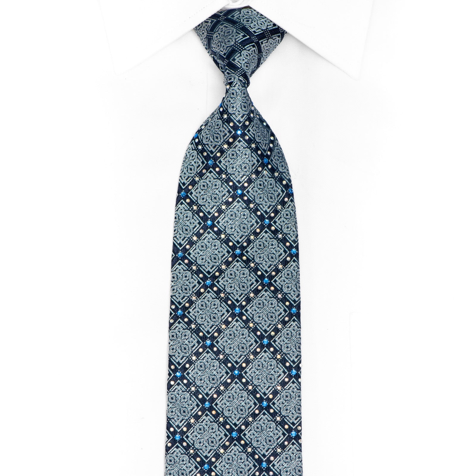 Navy & Silver Geometric Diamond Silk Necktie with Rhinestone Accents