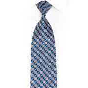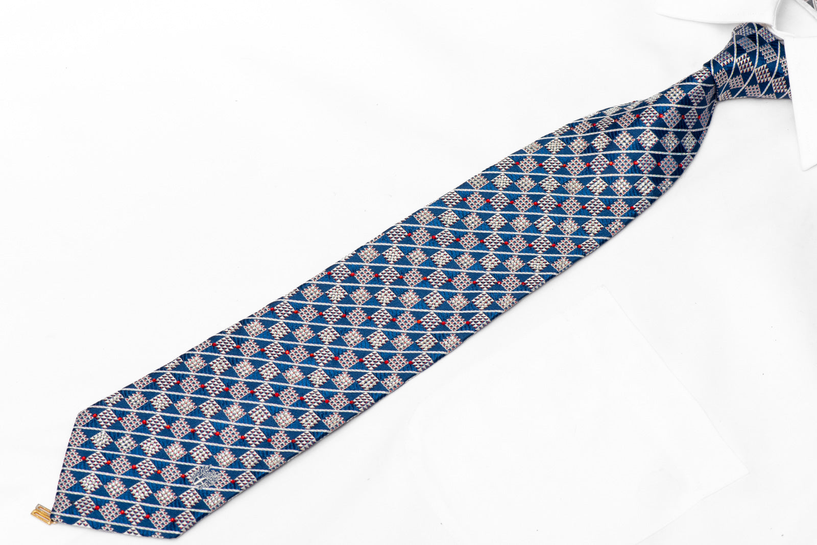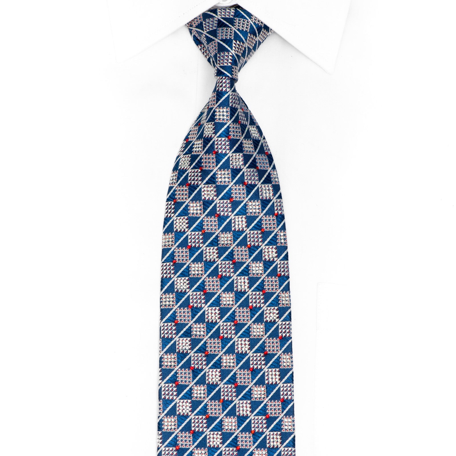 Elevate your formal wardrobe with this exquisite woven silk necktie, where classic sophistication meets contemporary brilliance. Crafted from premium silk, this distinguished accessory features an intricate geometric pattern in rich navy blue, accented with silver-toned rhinestone embellishments that catch the light with every movement.