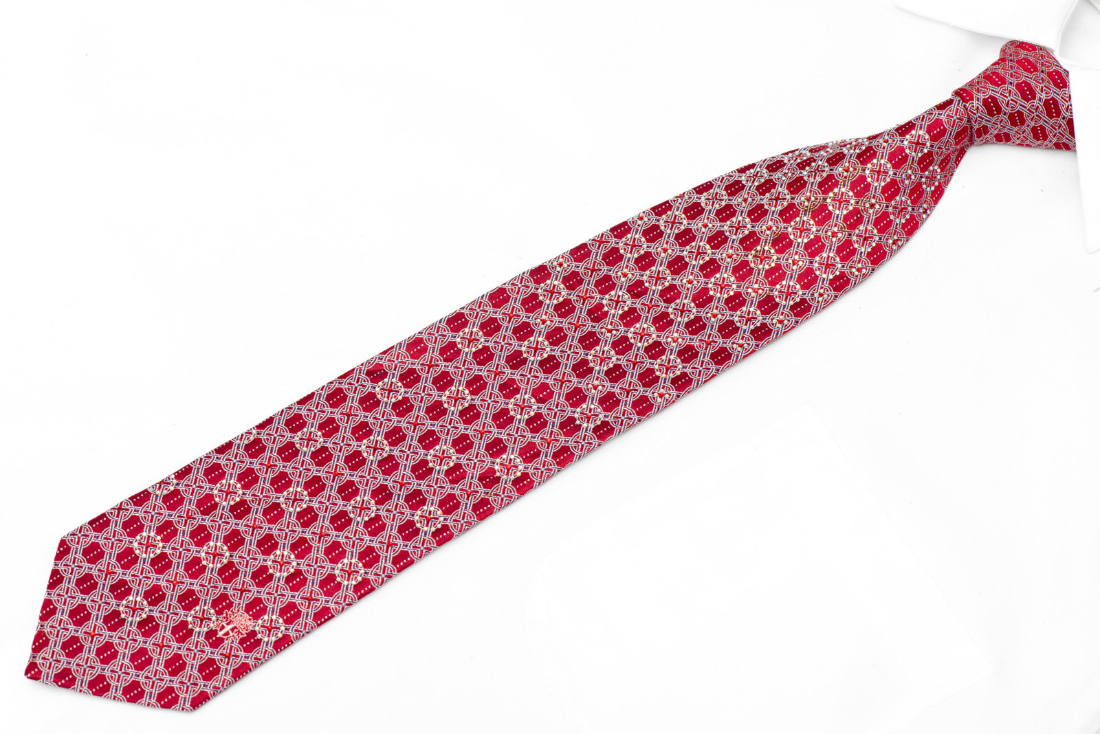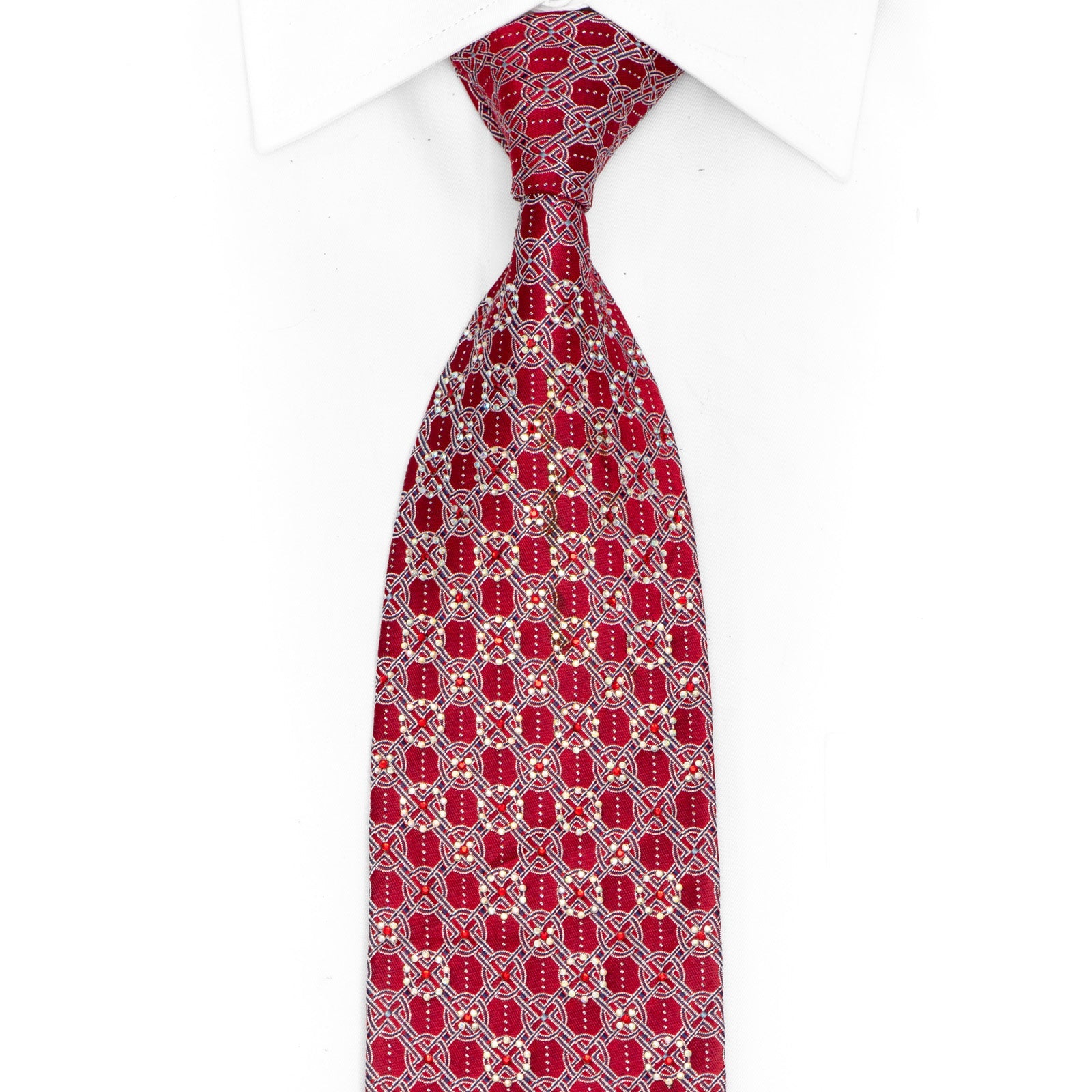 Make a memorable impression with this luxurious silk tie that blends timeless elegance with contemporary sparkle. The deep crimson base showcases an intricate silver trellis design, while rhinestones and silver accents add a touch of glamour that catches every light. Crafted from premium silk, this tie drapes beautifully and feels wonderful against the skin. Whether you're attending a wedding, gala, or important business event, this refined accessory helps you express confidence and style with every wear.