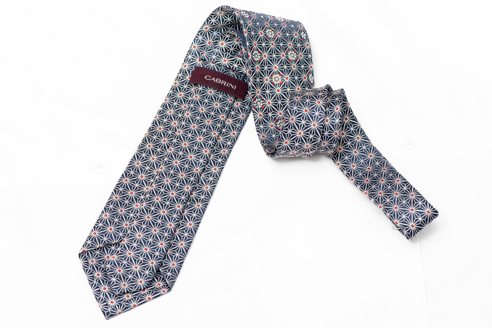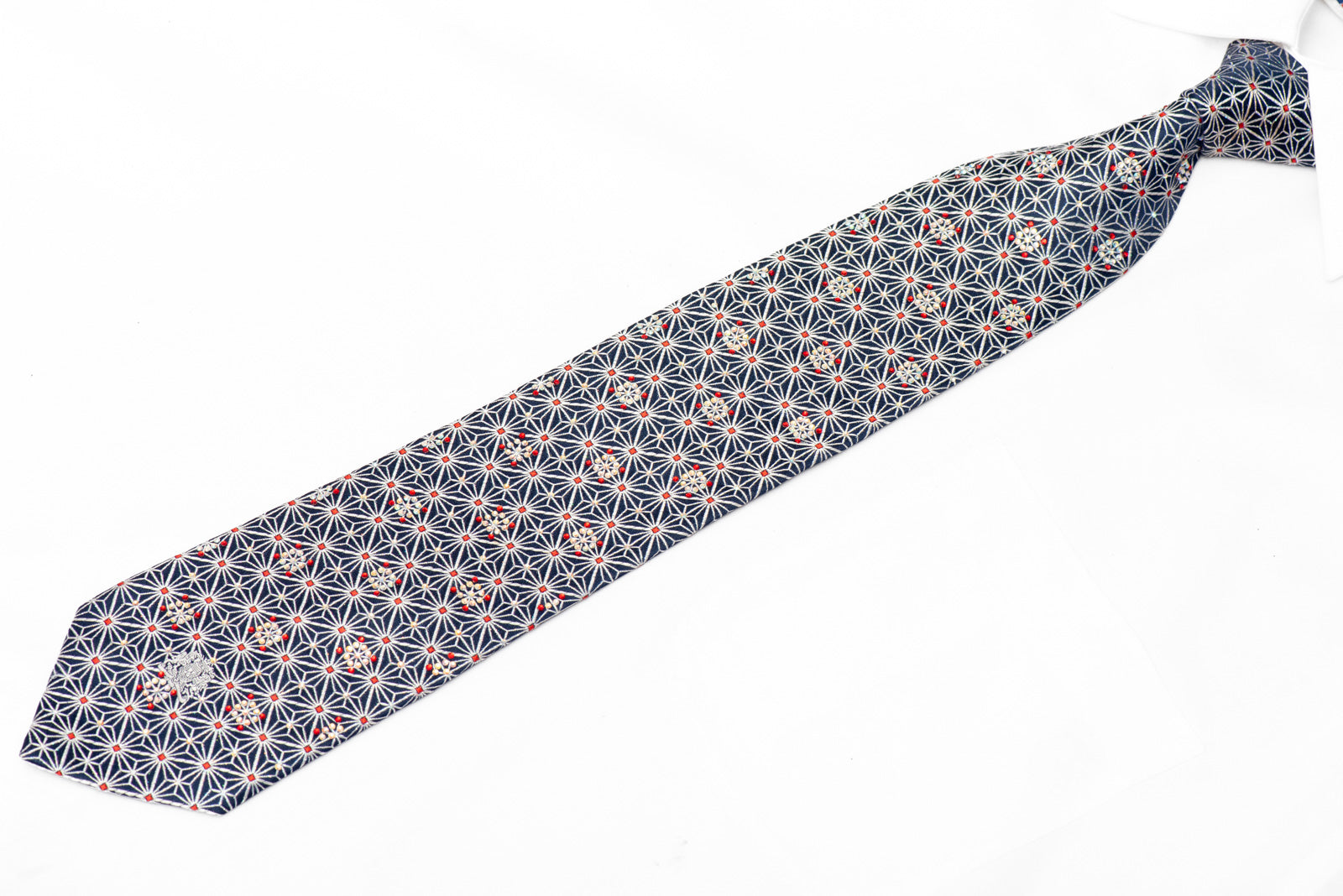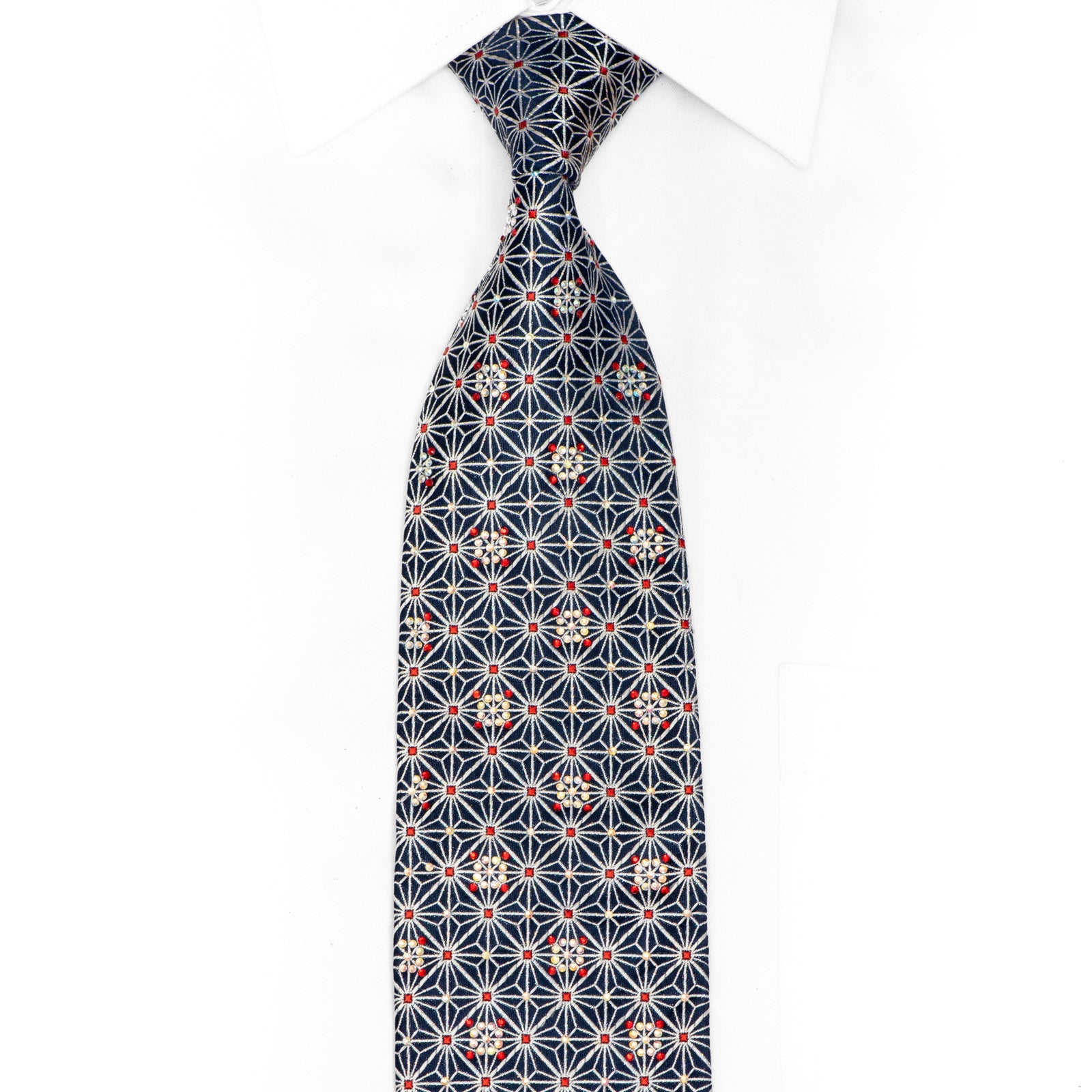 Make a dazzling statement with this exceptional woven silk tie that seamlessly blends artistry and elegance. Featuring a mesmerizing geometric star pattern inspired by traditional asanoha designs, this tie showcases deep navy blue silk adorned with eye-catching rhinestones and shimmering silver accents.