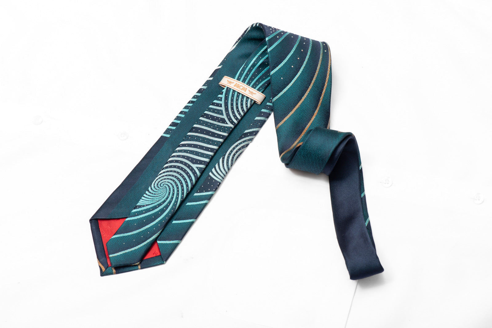 This silk necktie in navy blue showcases a sophisticated teal geometric pattern, enhanced by silver metallic sparkles and rhinestone details.