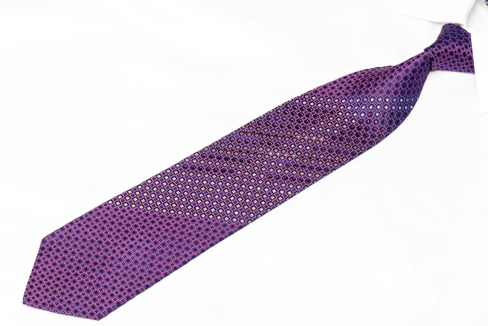 Add some flair to your wardrobe with this Purple Geometric Circles On Blue Rhinestone Silk Tie. The subtle pop of purple will catch anyone's eye, and the sparkles add a touch of fun to elevate your look.