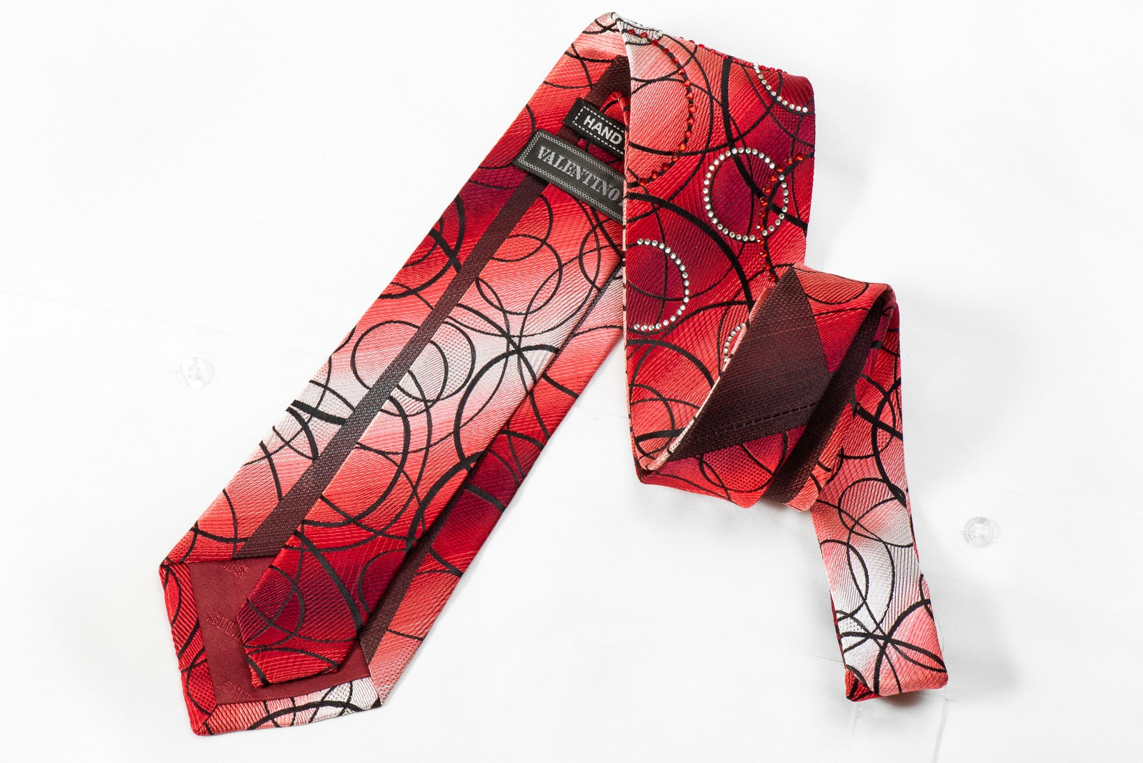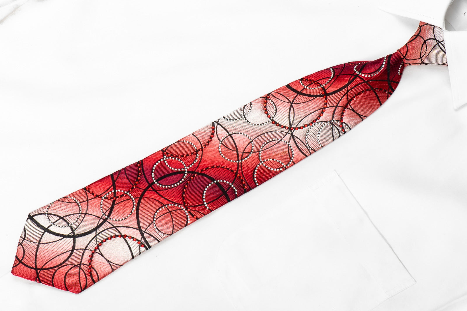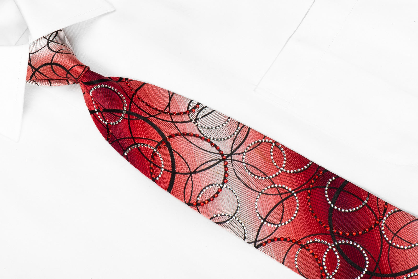 Stilvolle Herren-Krawatte mit Kristall-Strasssteinen, perfekt für jeden Anlass, handgefertigt aus feinster Seide und entworfen von der Top-Marke Valentino Rich. Präsentiert ein elegantes, gewebtes schwarzes geometrisches Kreisdesign auf Rot, funkelnd mit klaren, weißen, roten Kristall-Strasssteinen.