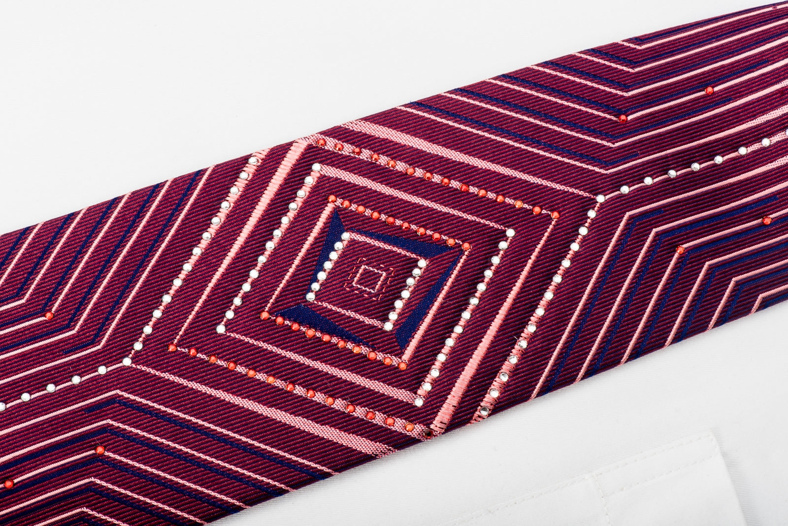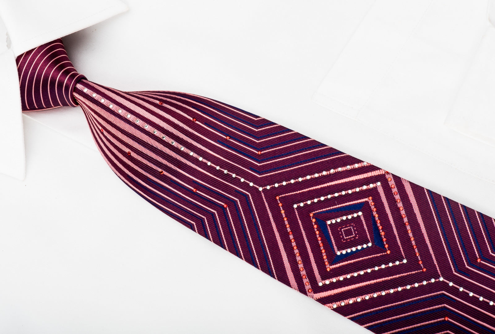 Entwurf -GeometrischFarbe-BurgundLänge - Klassisch (57 bis 60 Zoll) (145 bis 153 cm)Breite - Klassisch (3 1/4 Zoll bis 3 3/4 Zoll) (8 cm bis 9,5 cm)Farb-Mix BurgundMustermix - GeometrischBesonderheiten - Rote Strasssteine, rote Glitzer, weiße Strasssteine
