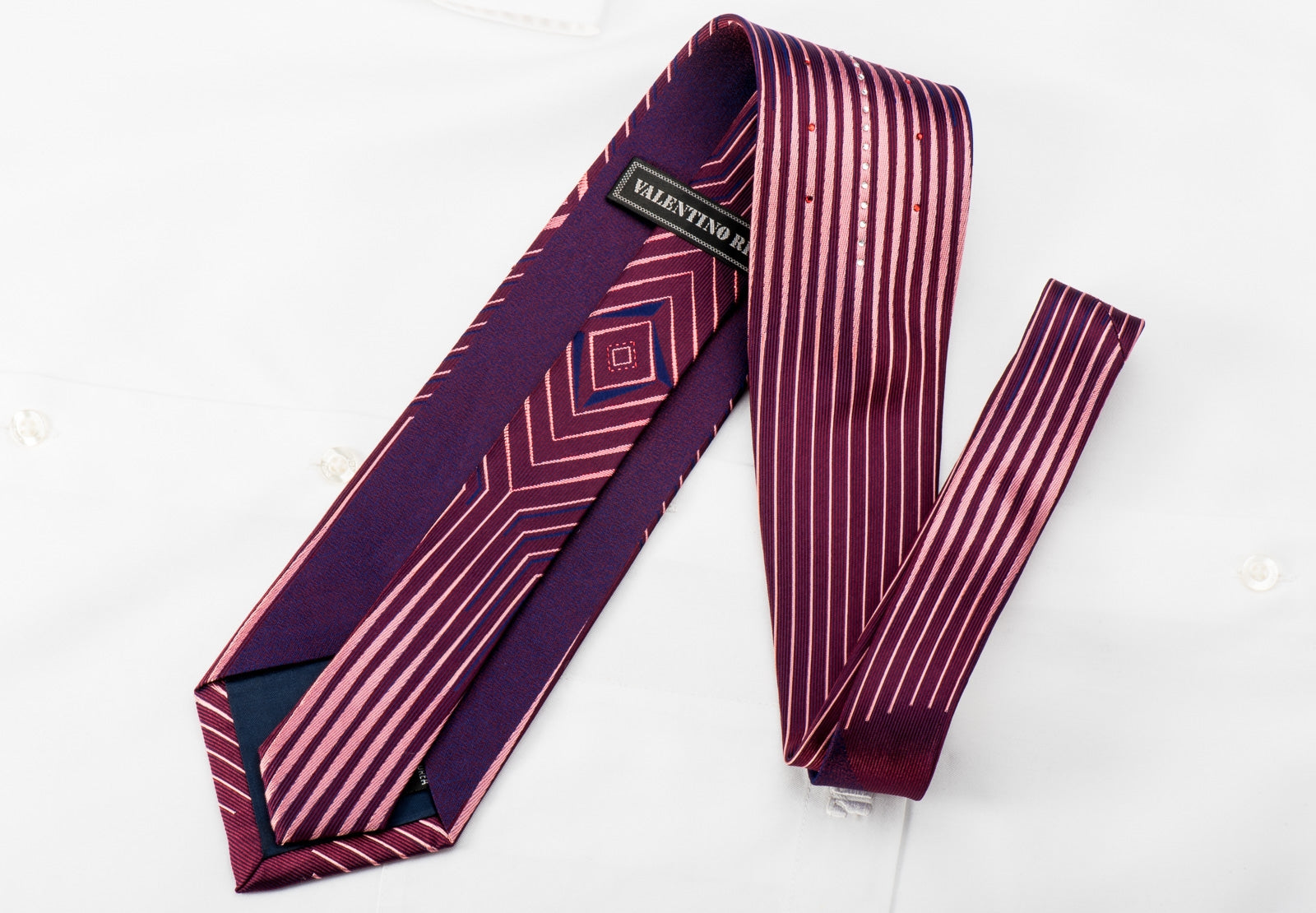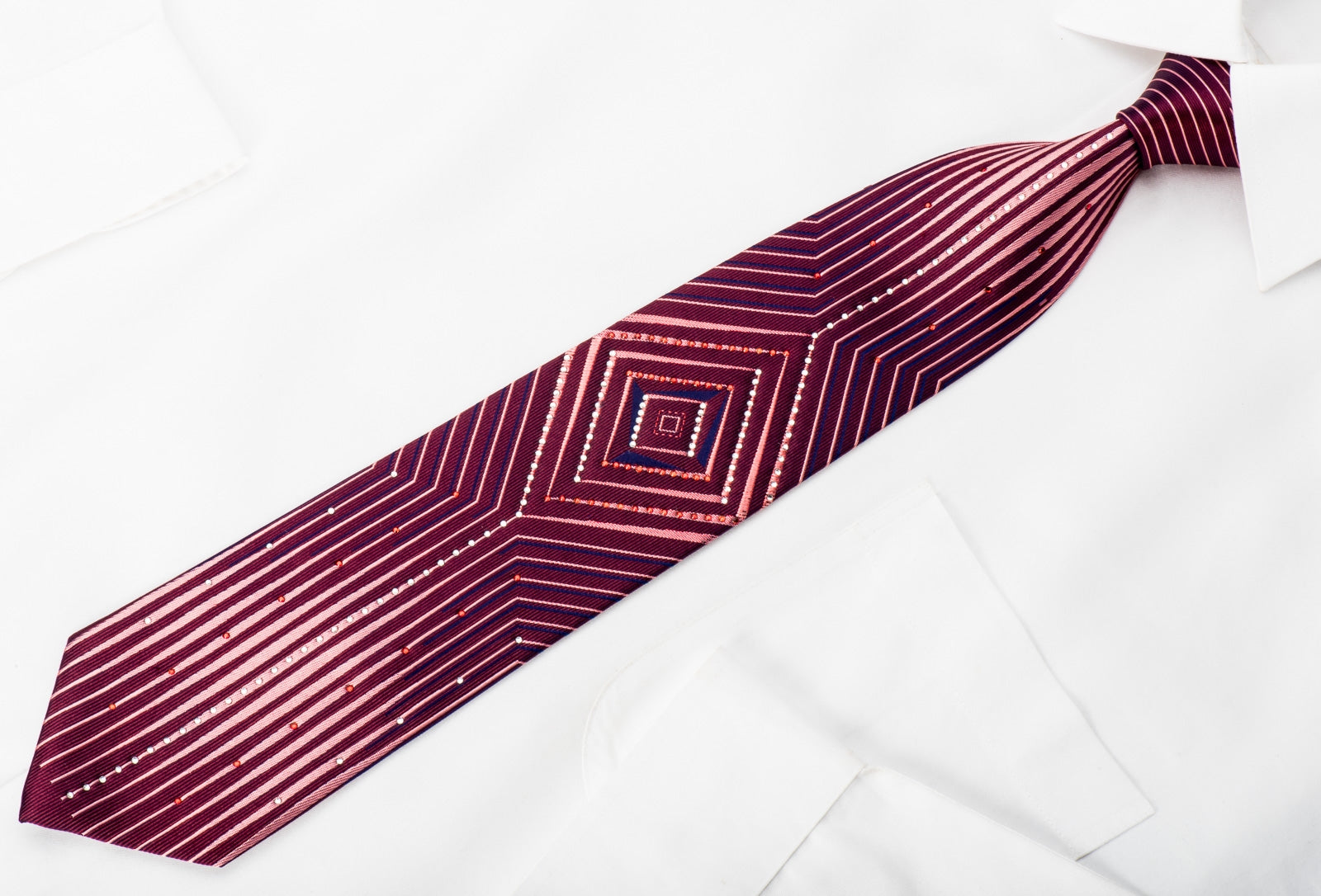 Heben Sie sich von der Masse ab, indem Sie diese wunderschöne Herrenkrawatte aus gewebter Seide mit Strasssteinen tragen, die vom Top-Markennamen Valentino Rich entworfen wurde. Präsentiert ein stilvolles Design mit geometrischen Streifen auf burgunderfarbener gewebter Seide, funkelnd mit weißen, burgunderfarbenen Strasssteinen mit roten Glitzern.