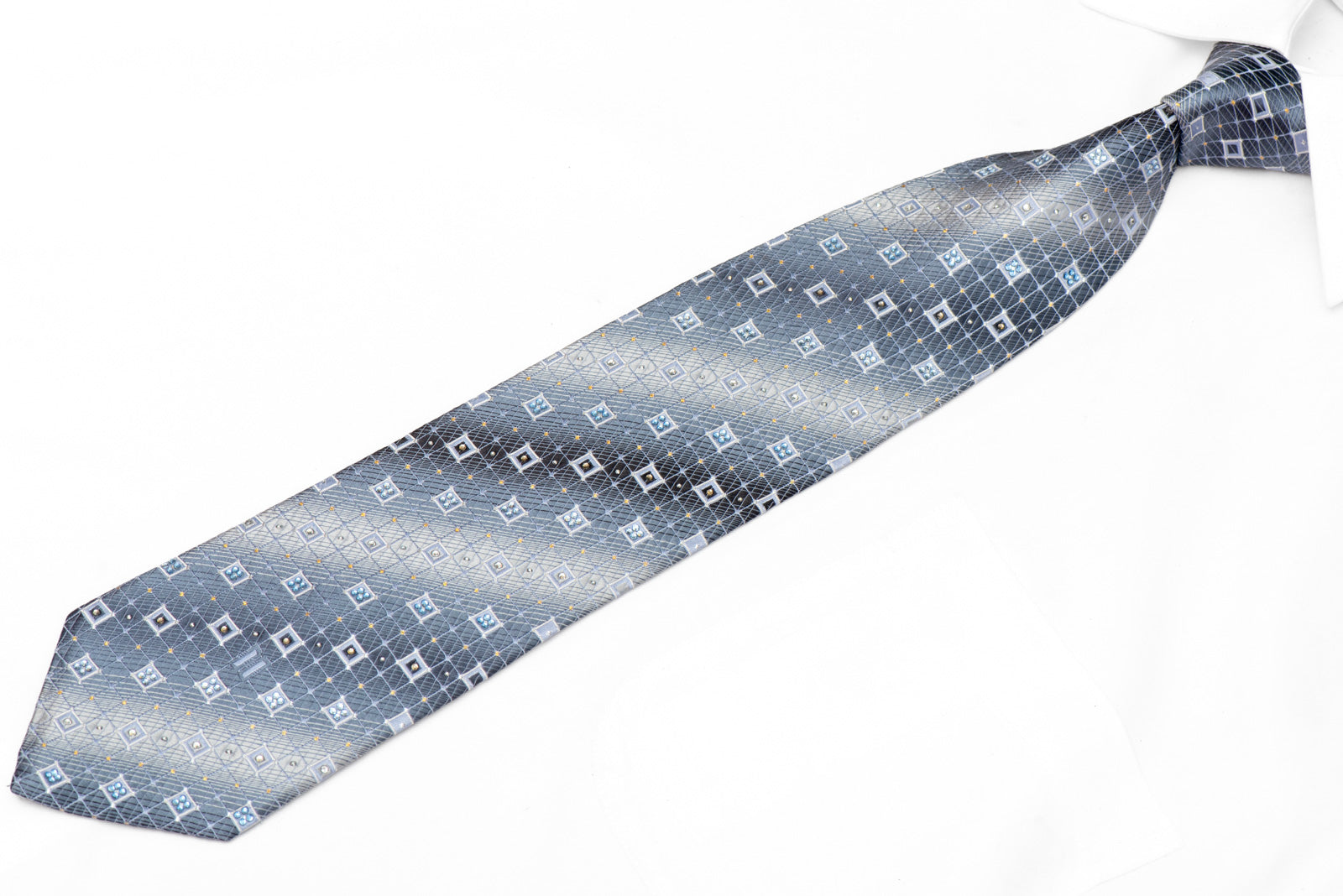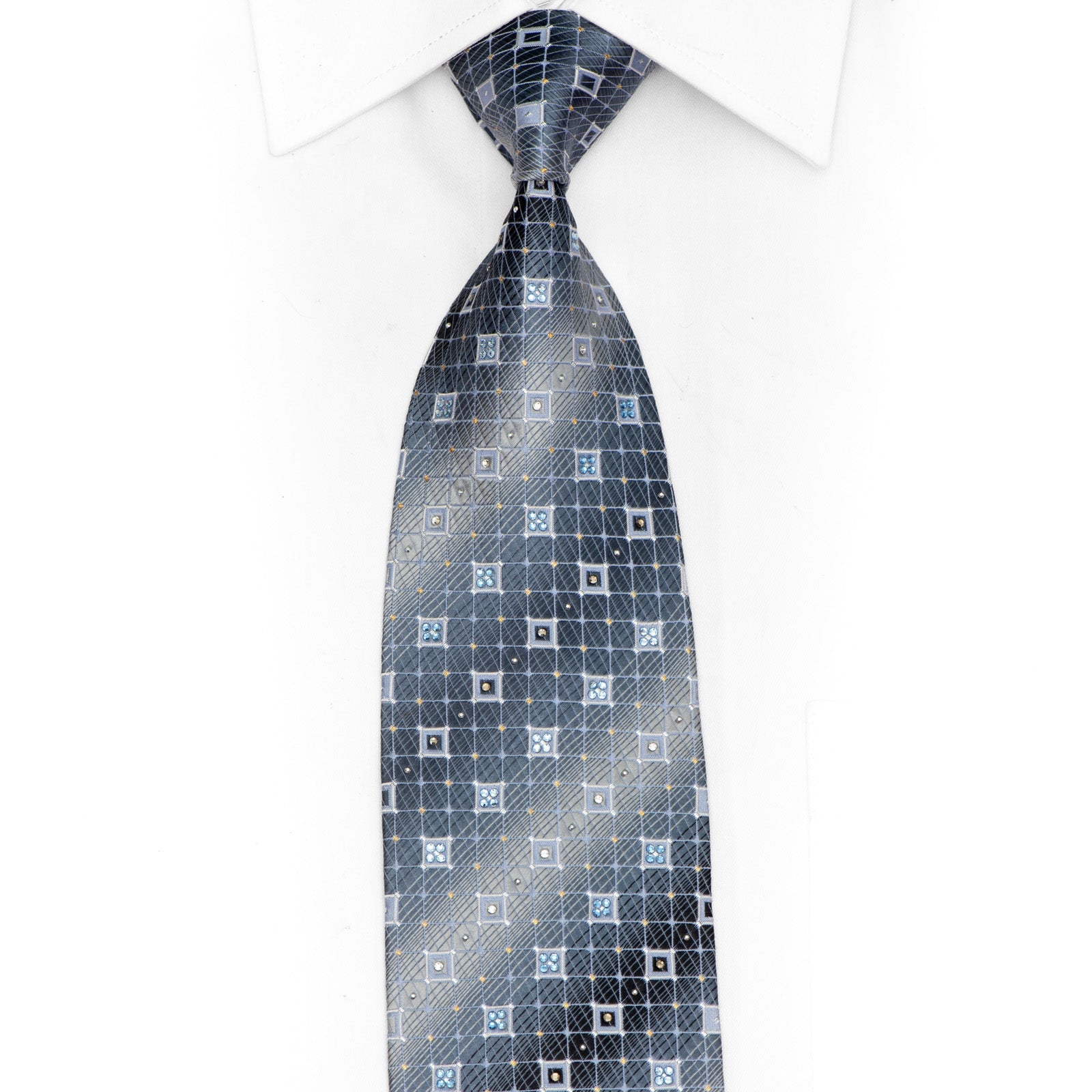 Material - SilkDesign - Checkered TrellisColor - Silver, BlueLength - Classic (48 in.-60 in.)(145cm-153 cm)Width - Classic (3 1/4 in.-3 3/4 in.)(8 cm-9.5 cm)Special Features - Rhinestones, Silver Sparkles