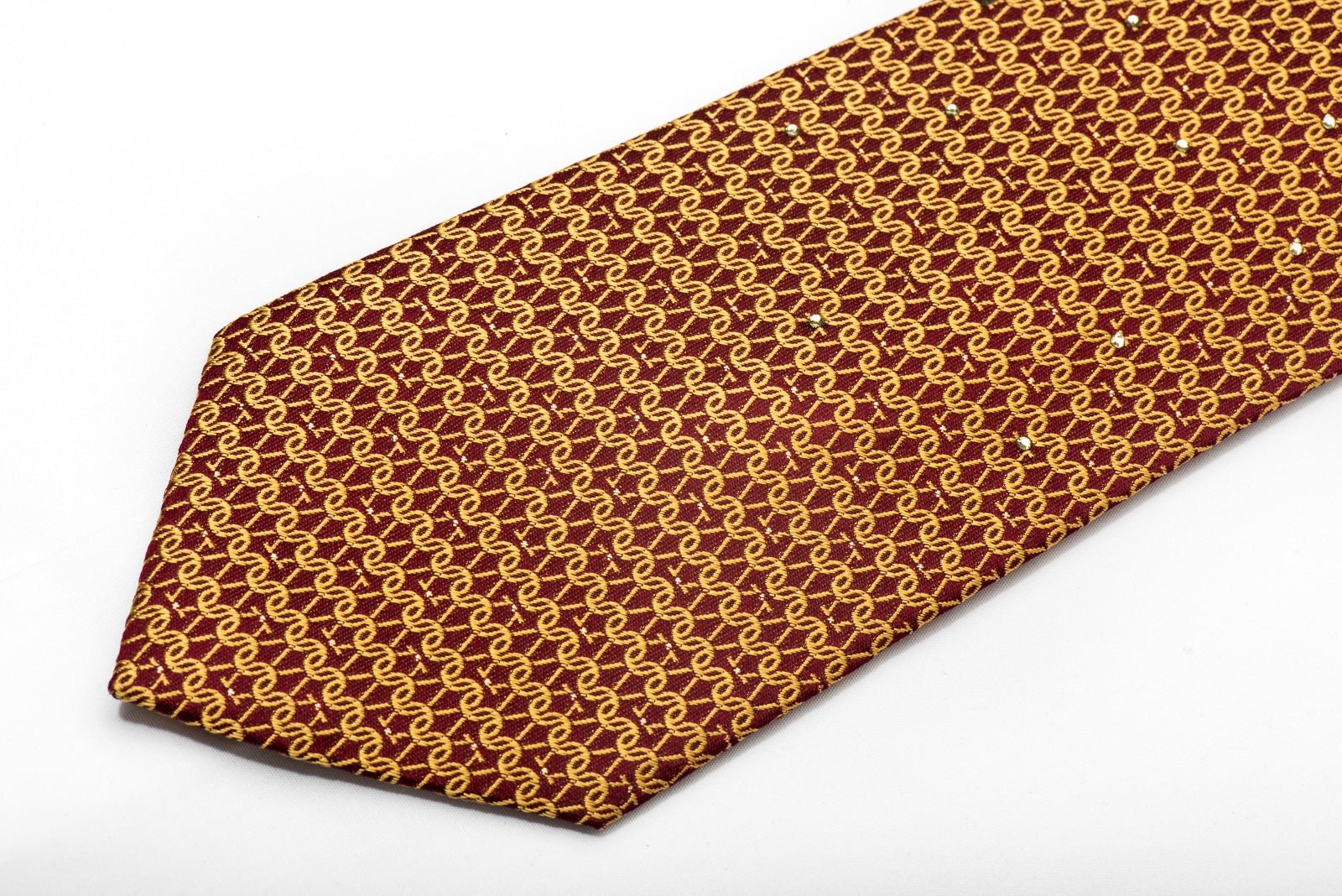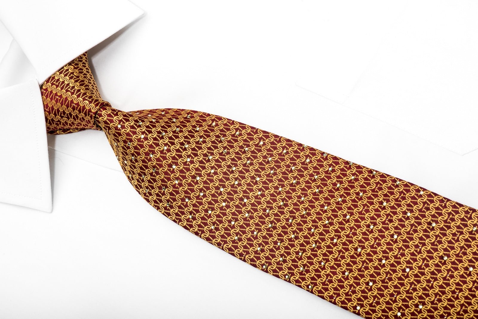 Elevate your formal wardrobe with this exquisite men's necktie from Elle Homme. Crafted from premium burgundy silk, this piece showcases an elegant golden chain mail pattern adorned with shimmering crystal rhinestones and silver accents. Each tie is meticulously handmade to deliver sophisticated style and refined elegance for special occasions or upscale events. A true statement accessory that combines luxury materials with striking visual appeal.