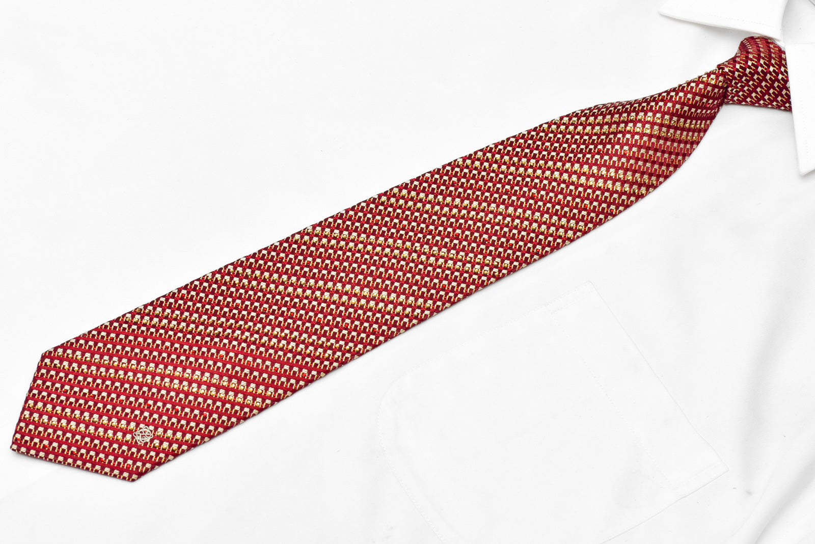 This stunning tie features a dazzling combination of gold geometric patterns and sparkling burgundy rhinestones on soft, luxurious silk. Perfect for adding a touch of sophistication and glamour to any outfit.