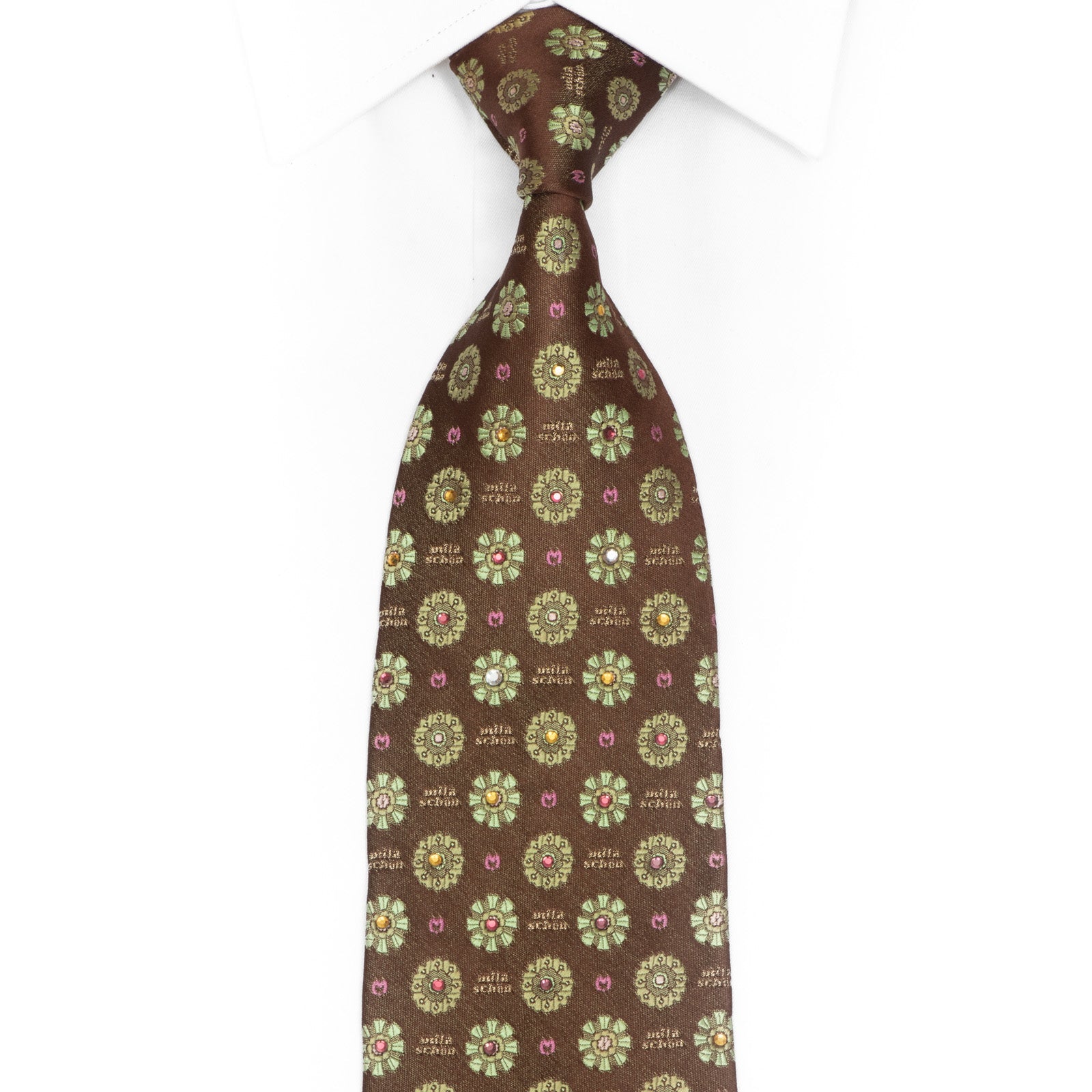 Add a touch of elegance to your wardrobe with the Green Foulard On Brown Rhinestone Silk Necktie With Silver Sparkles. It's the perfect accessory to elevate any outfit and make you stand out.