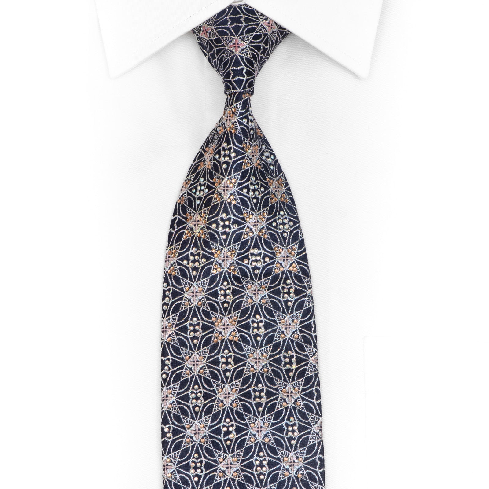 Silver Trellis On Navy Blue Rhinestone Silk Tie With Silver Sparkles