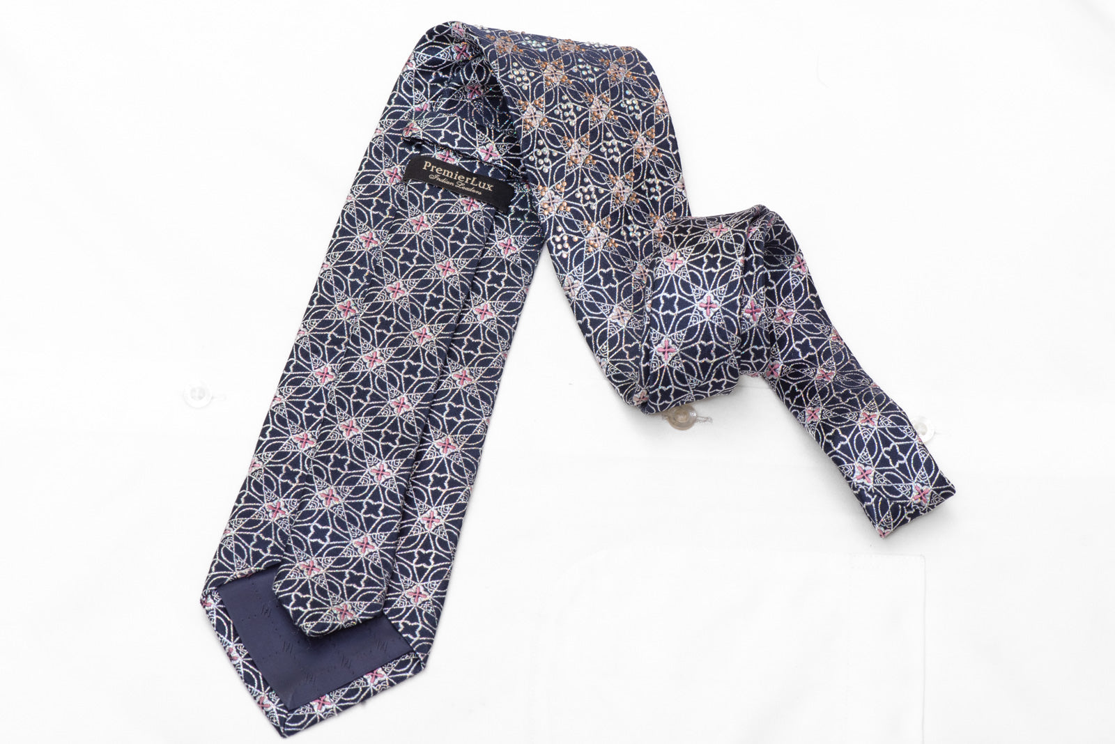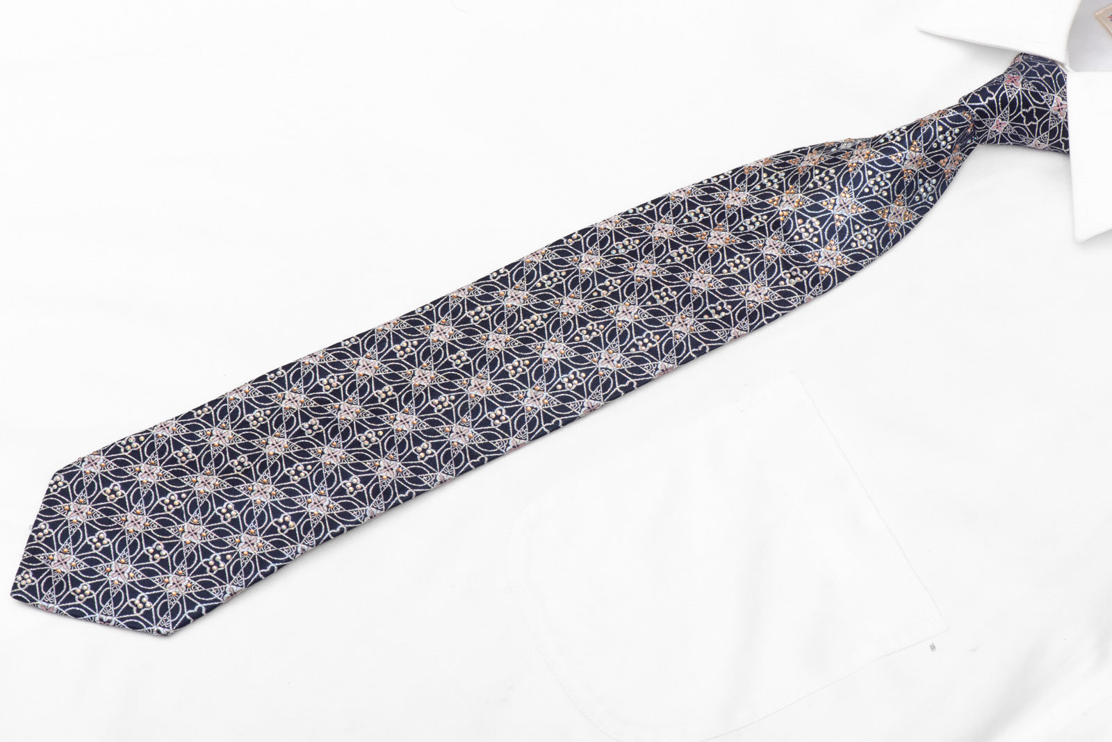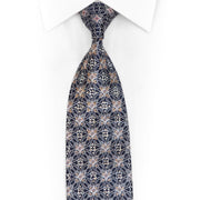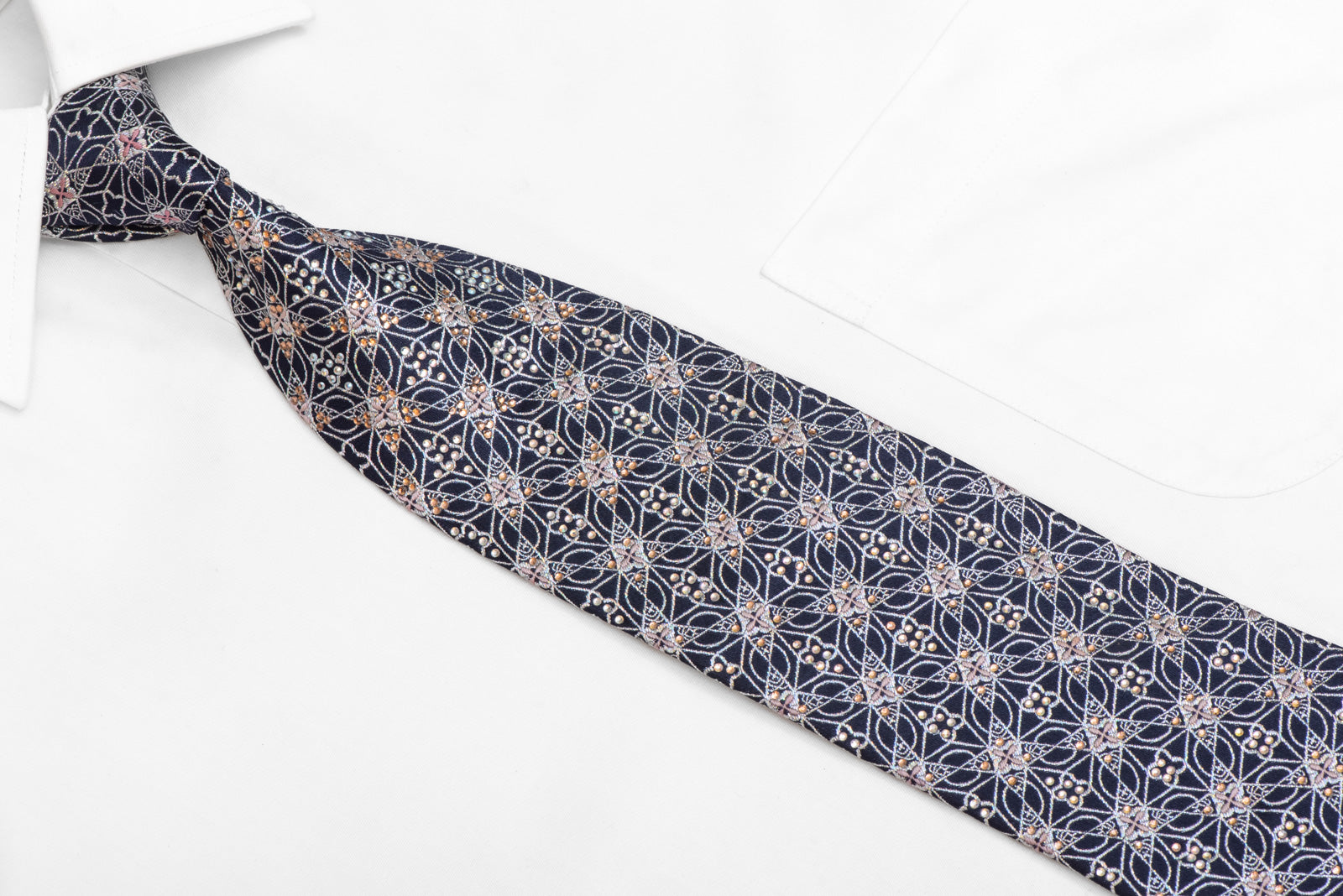 Silver Trellis On Navy Blue Rhinestone Silk Tie With Silver