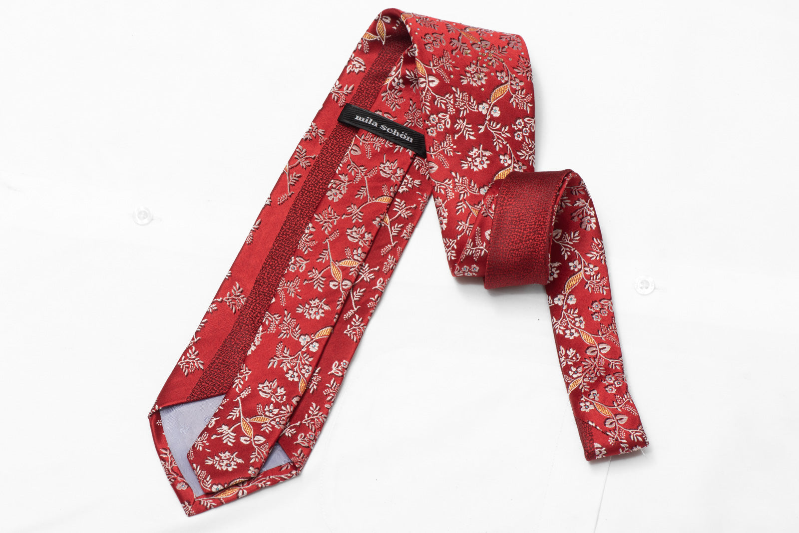 This stylish silk tie features a beautiful silver floral design on a red background, accented with rhinestones and a touch of gold, blue and silver sparkles.