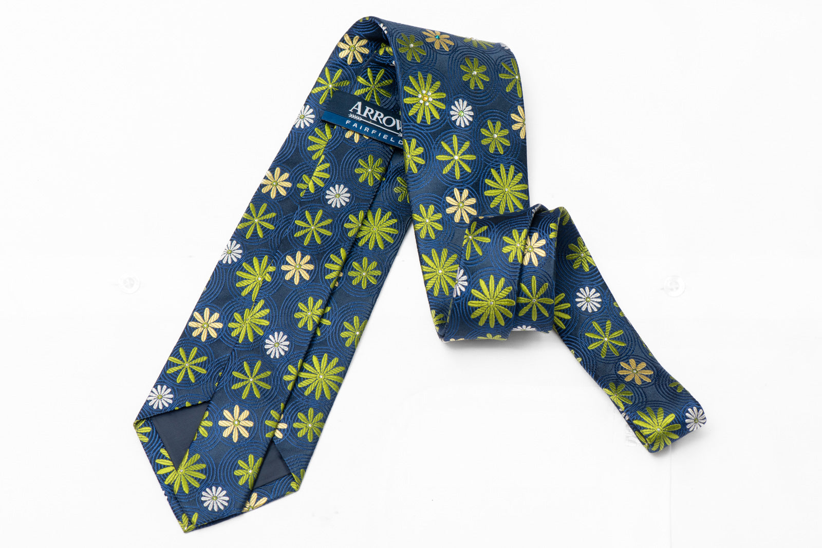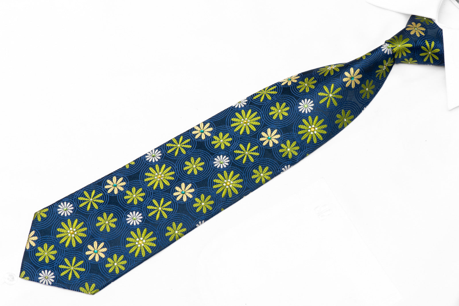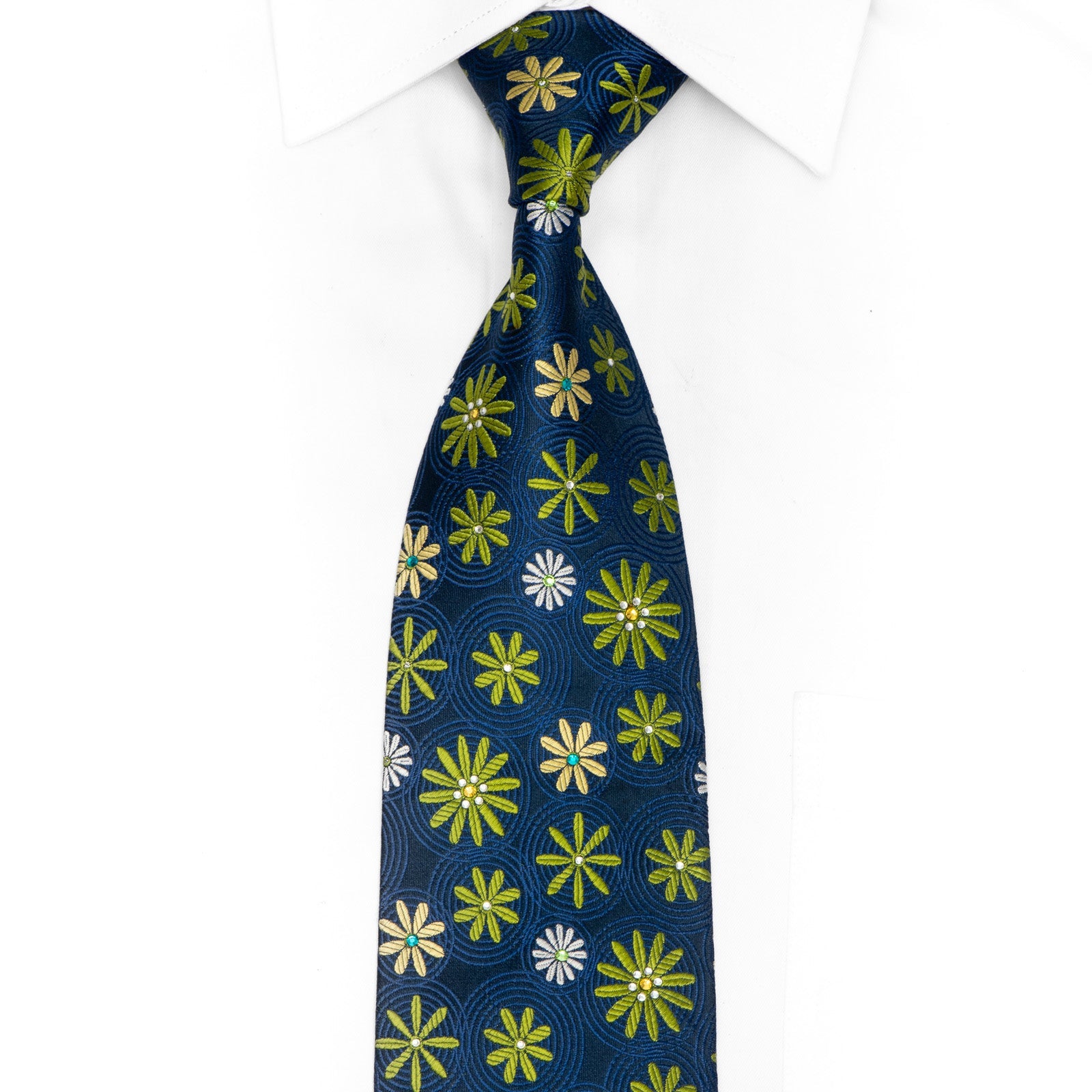 Green Floral On Navy Blue Rhinestone Silk Necktie