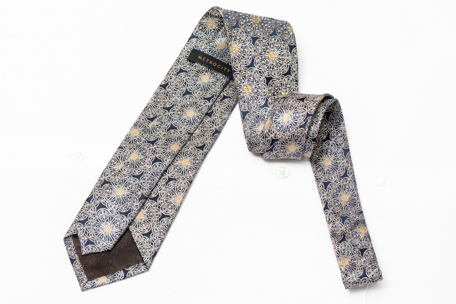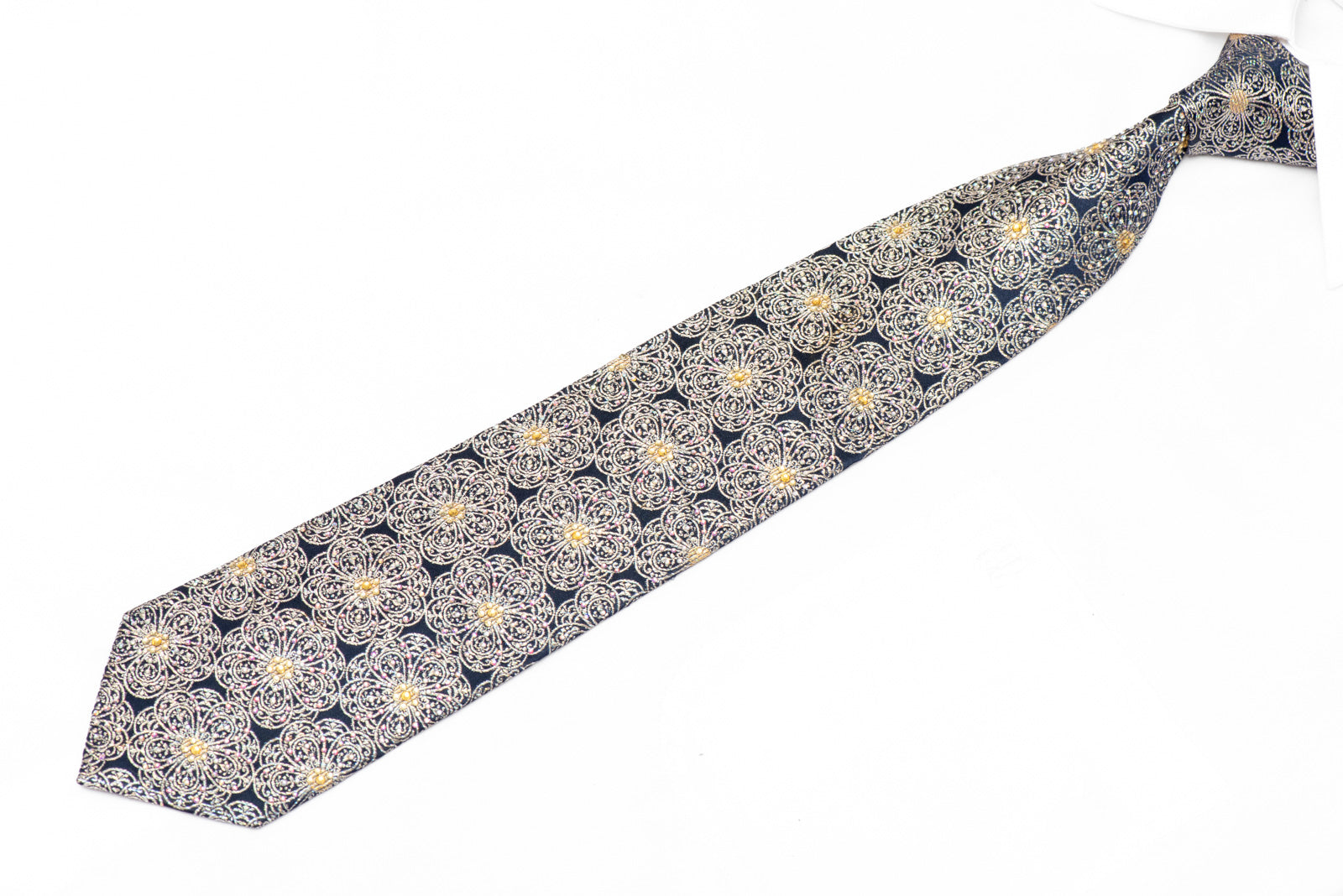 Elevate your look with this navy blue tie adorned with silver medallions and shimmering rhinestones, enhanced by delicate silver sparkles for a refined finish.