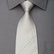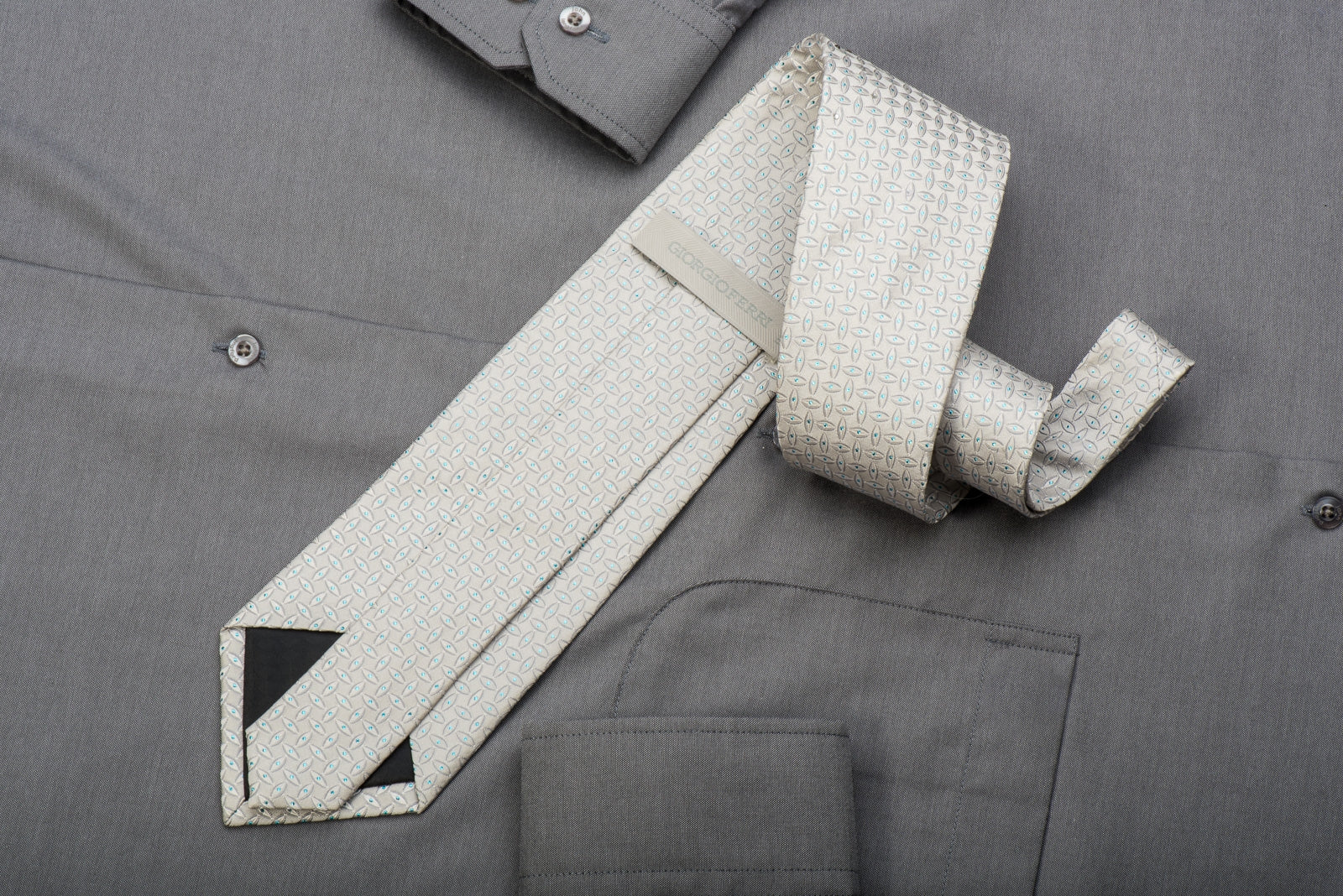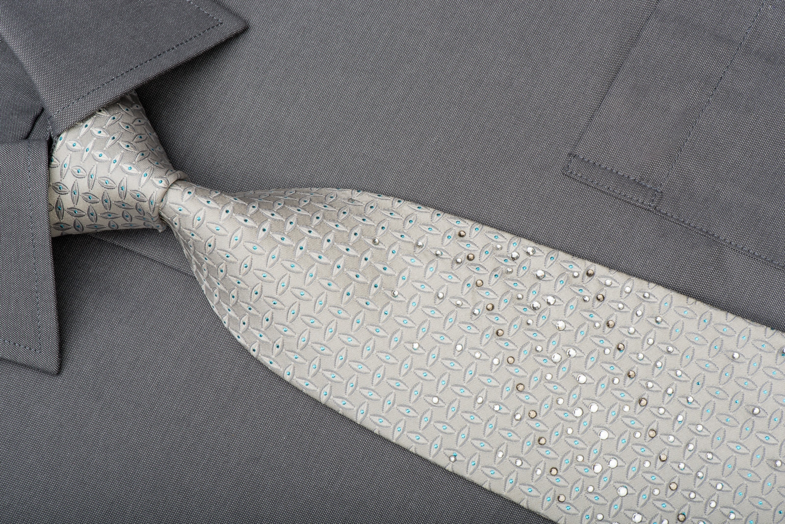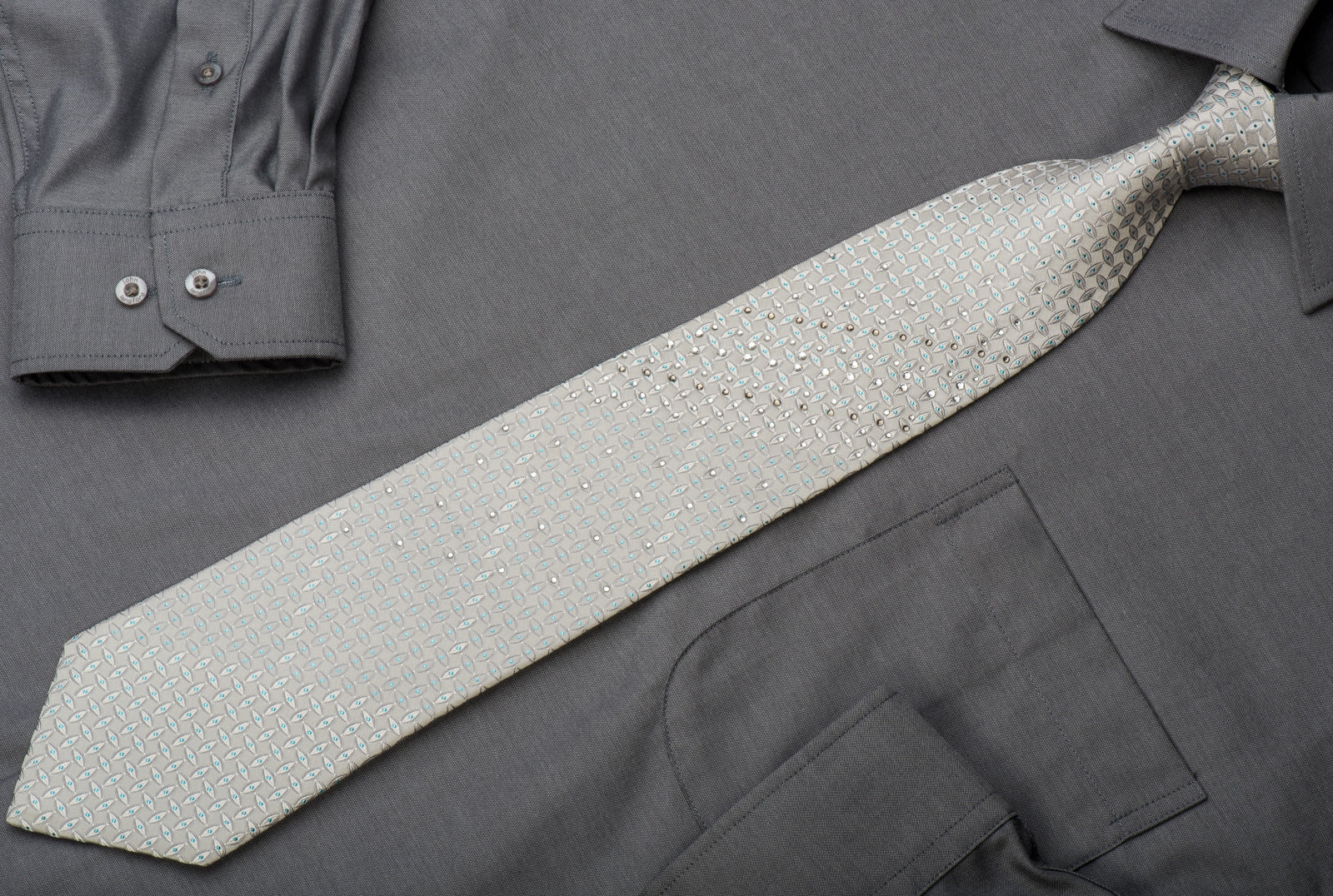 Stylish Rhinestone silk necktie perfect for every occasion handmade from the finest quality silk and designed by top brand name Giorgio Ferri. Presenting an elegant geometric design on woven silver silk, sparkling with white, gray Rhinestones and blue sparkles.
