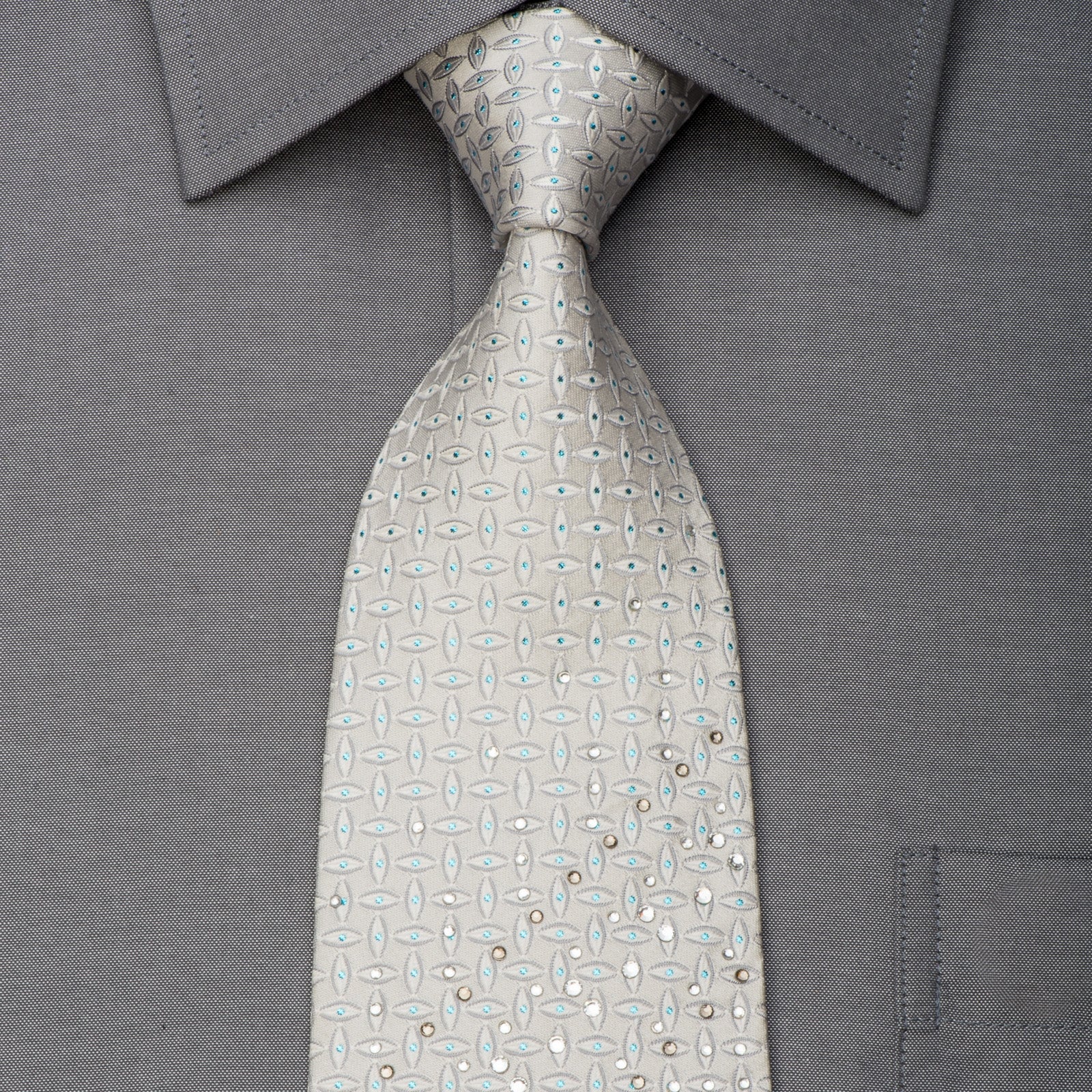 Material - SilkDesign - GeometricColor - SilverLength - Classic (57 in.-60 in.)(145 cm-153 cm)Width - Classic (3 1/4 in.-3 3/4 in.)(8 cm-9.5 cm)Special Features - Blue Sparkles, Gray Rhinestones, White Rhinestones