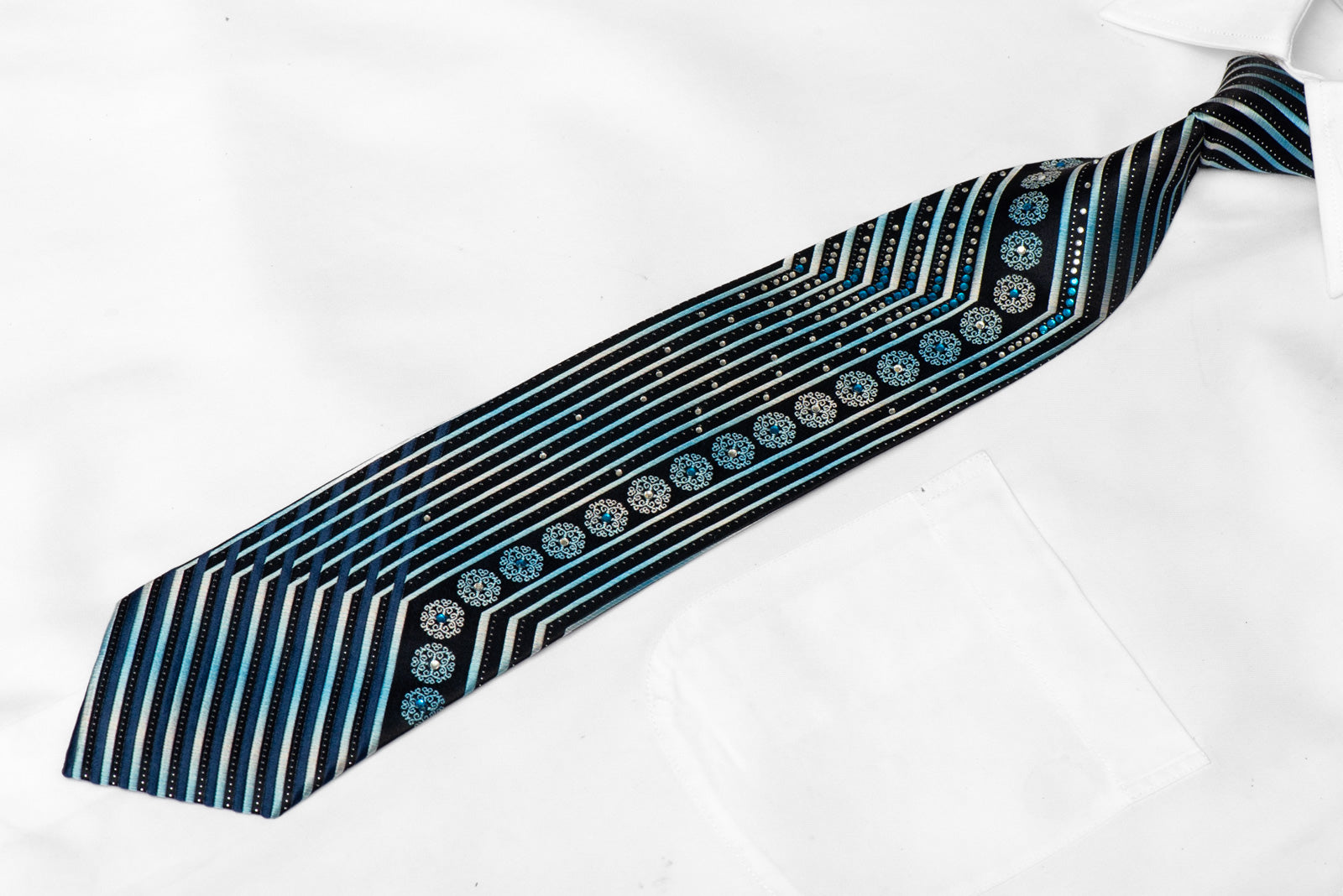 Blue Striped On Navy Rhinestone Tie With Silver Sparkles