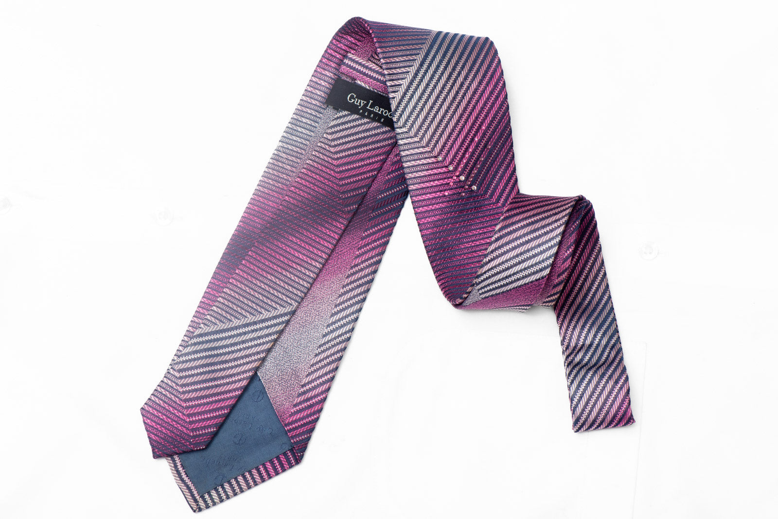 Looking for a stylish and unique tie to add to your collection? Look no further than our Pink Geometric Striped On Navy Rhinestone Silk Tie With Sparkles! With its eye-catching design and shimmery accents, this tie is sure to make a statement..