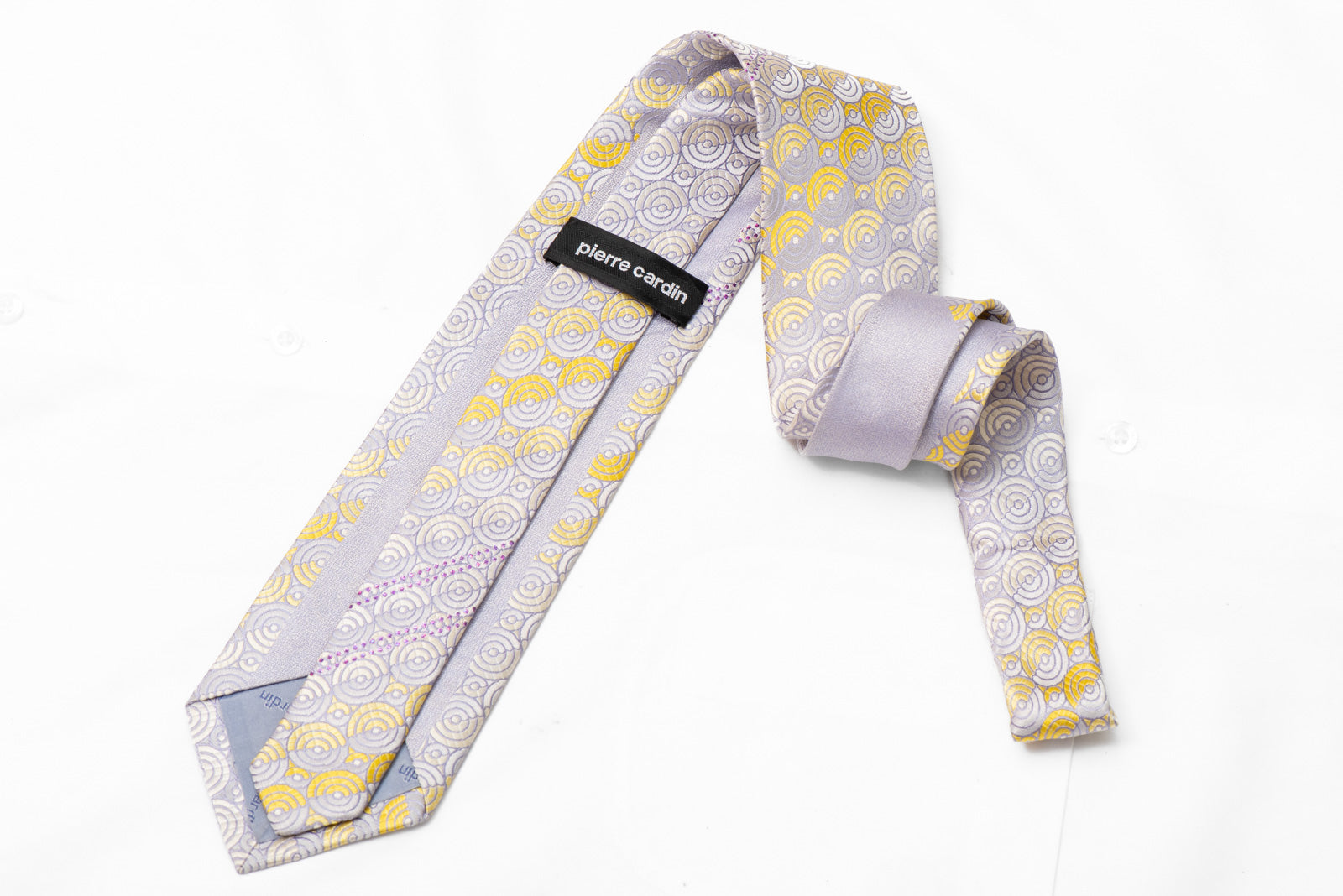 This mauve silk necktie showcases a refined geometric pattern in purple and yellow, enhanced by subtle purple sparkles for an elegant touch.