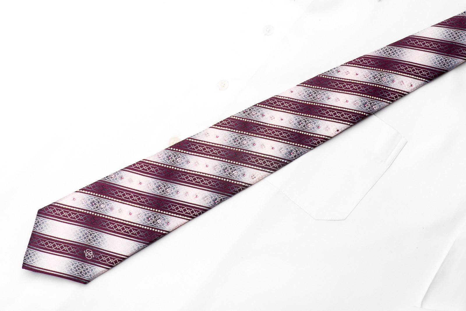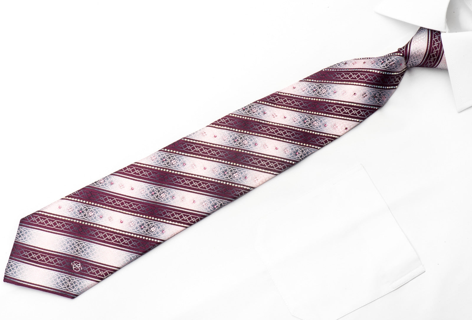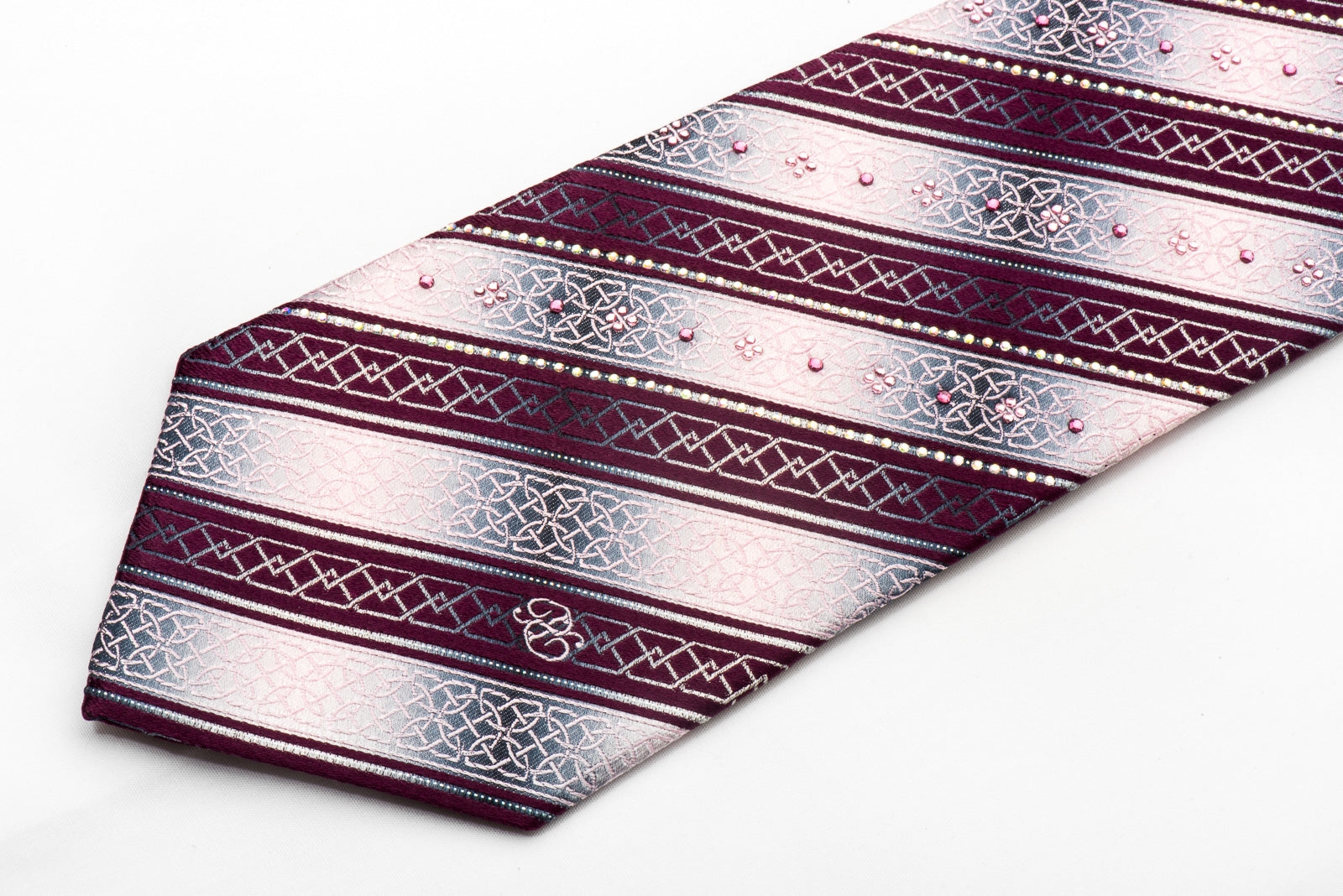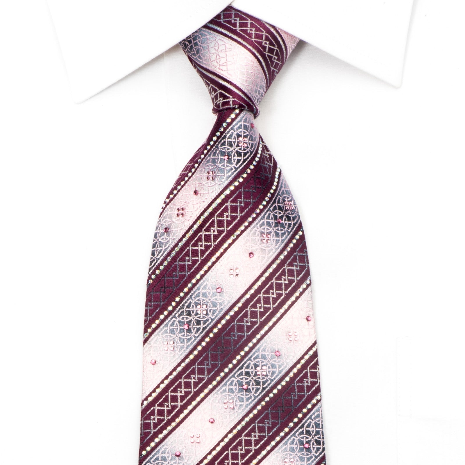 A must-have men's accessory, this sleek silk necktie is an ideal accent for any formal occasion. Showcasing a sophisticated striped design of burgundy, pink and silver, it's adorned with crystal rhinestones and shimmering silver sparkles.