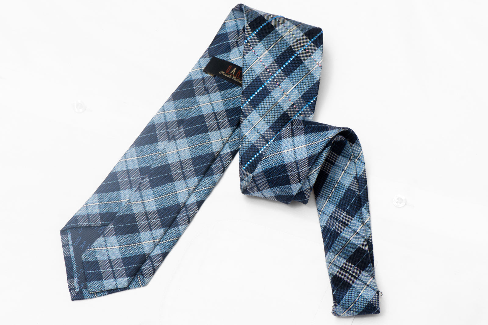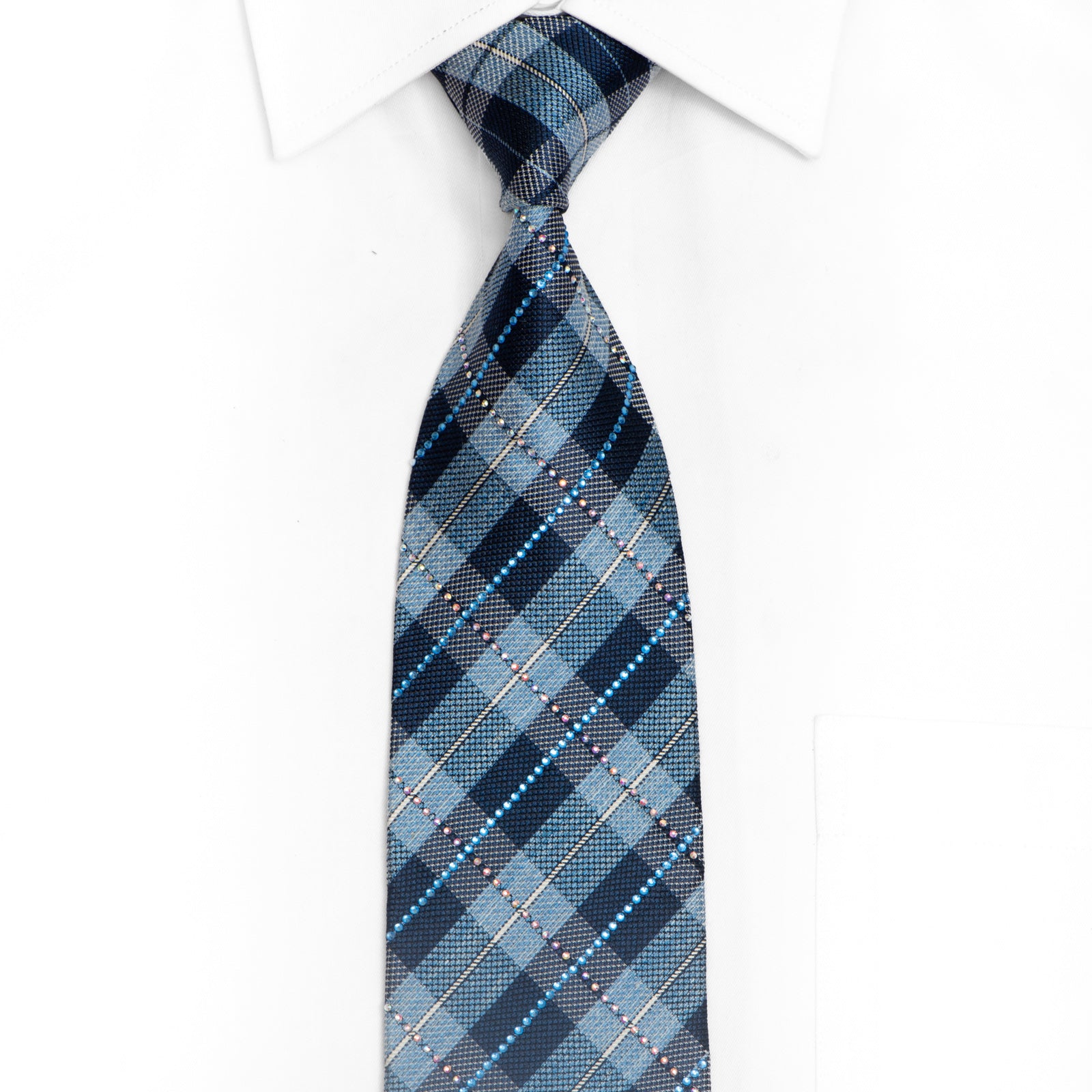 Blue Plaid Silk Necktie With Rhinestones Transform an average outfit into a stylish ensemble with this Blue Plaid Rhinestone Silk Necktie. The perfect addition to any formal or casual look, its classic design and sparkling rhinestones are sure to make a statement. Elevate your style game with this high-quality accessory.