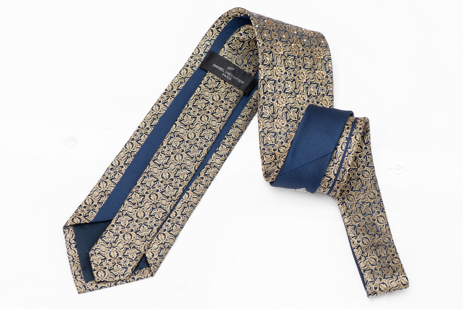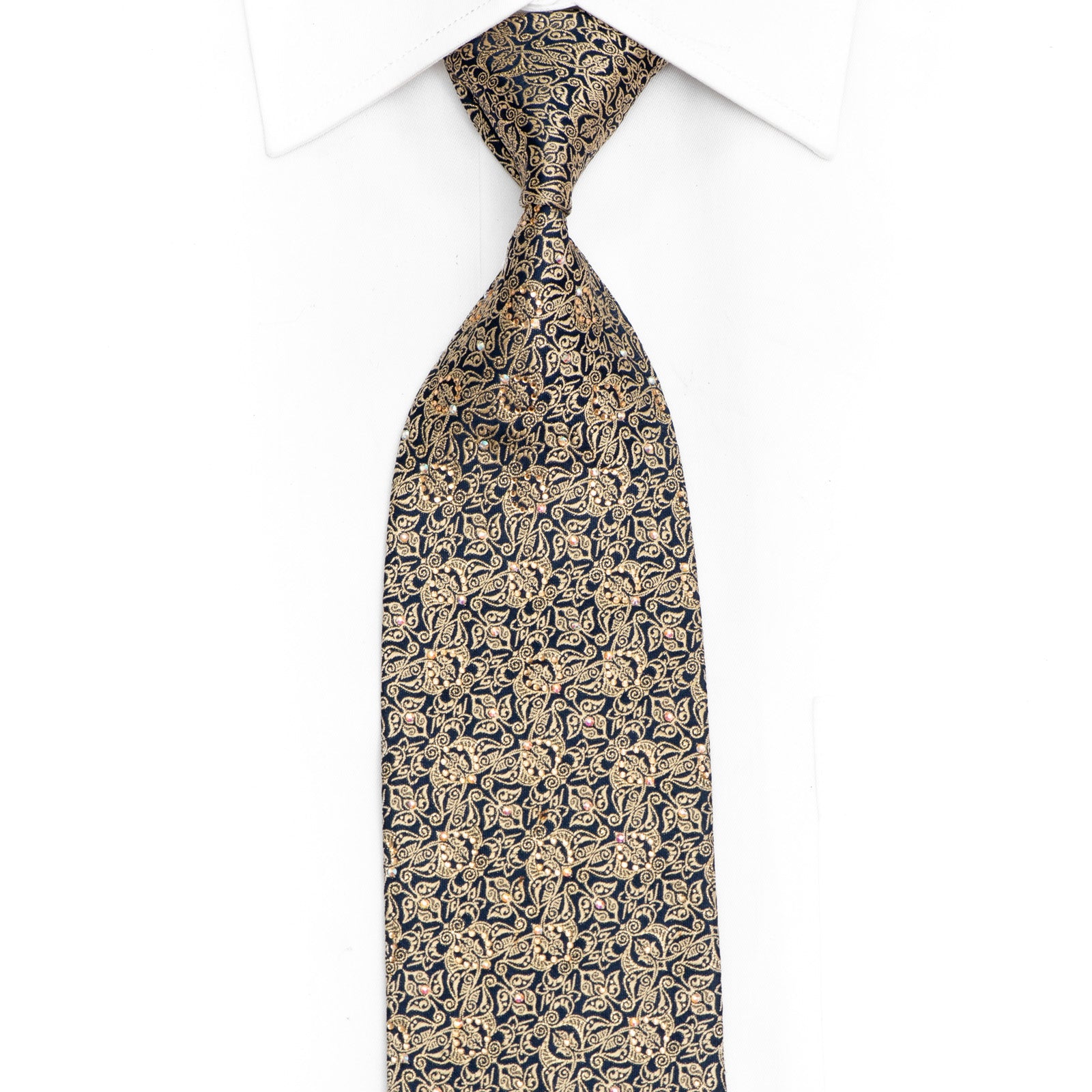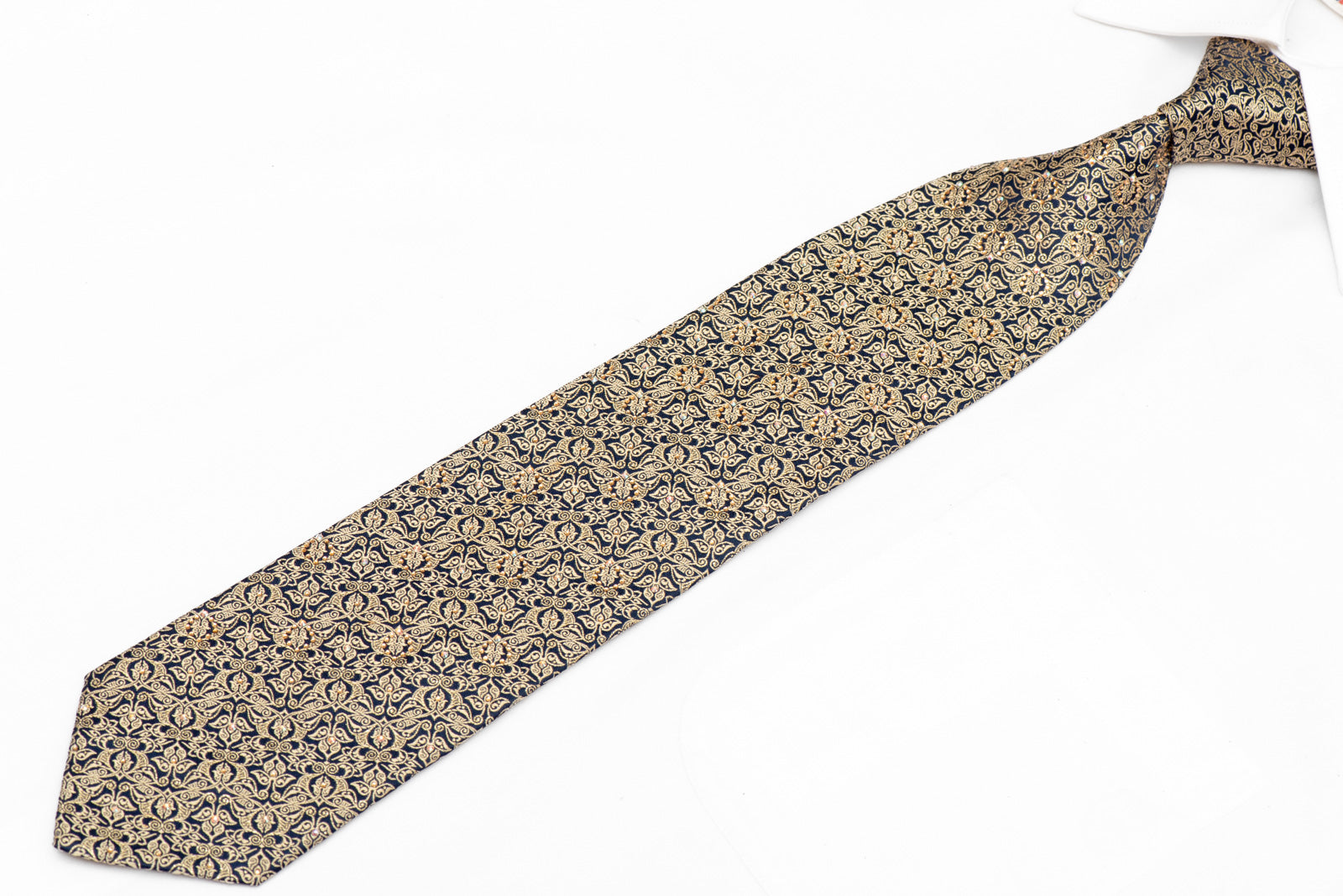 Make a confident statement with this exquisite navy tie featuring an ornate gold design complemented by dazzling rhinestone crystals and radiant gold accents. Perfect for special occasions, this accessory brings sophistication and glamour to your ensemble, helping you stand out with understated luxury. The intricate detailing and sparkling embellishments work together to create a polished, memorable look that reflects your appreciation for quality craftsmanship and timeless elegance.