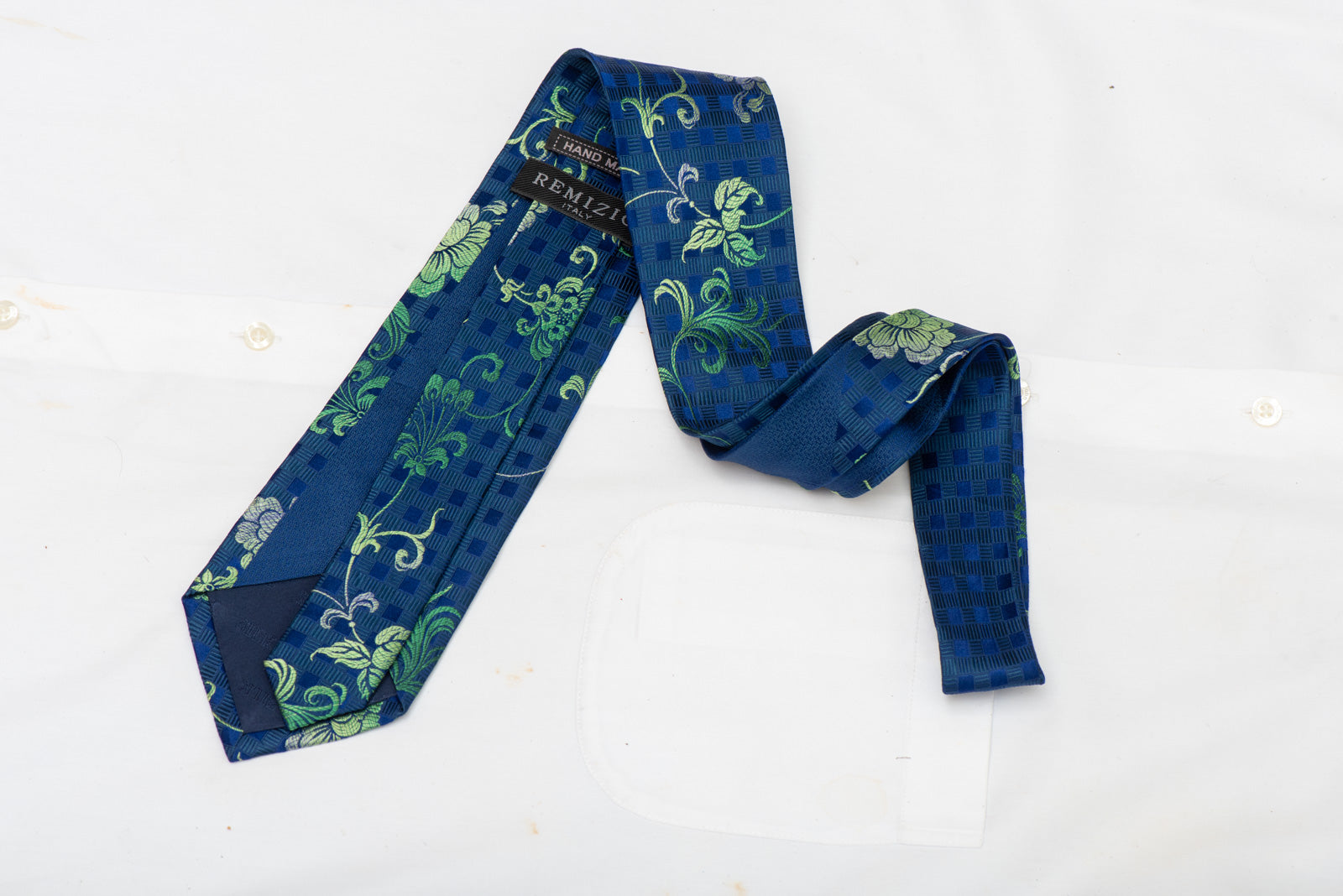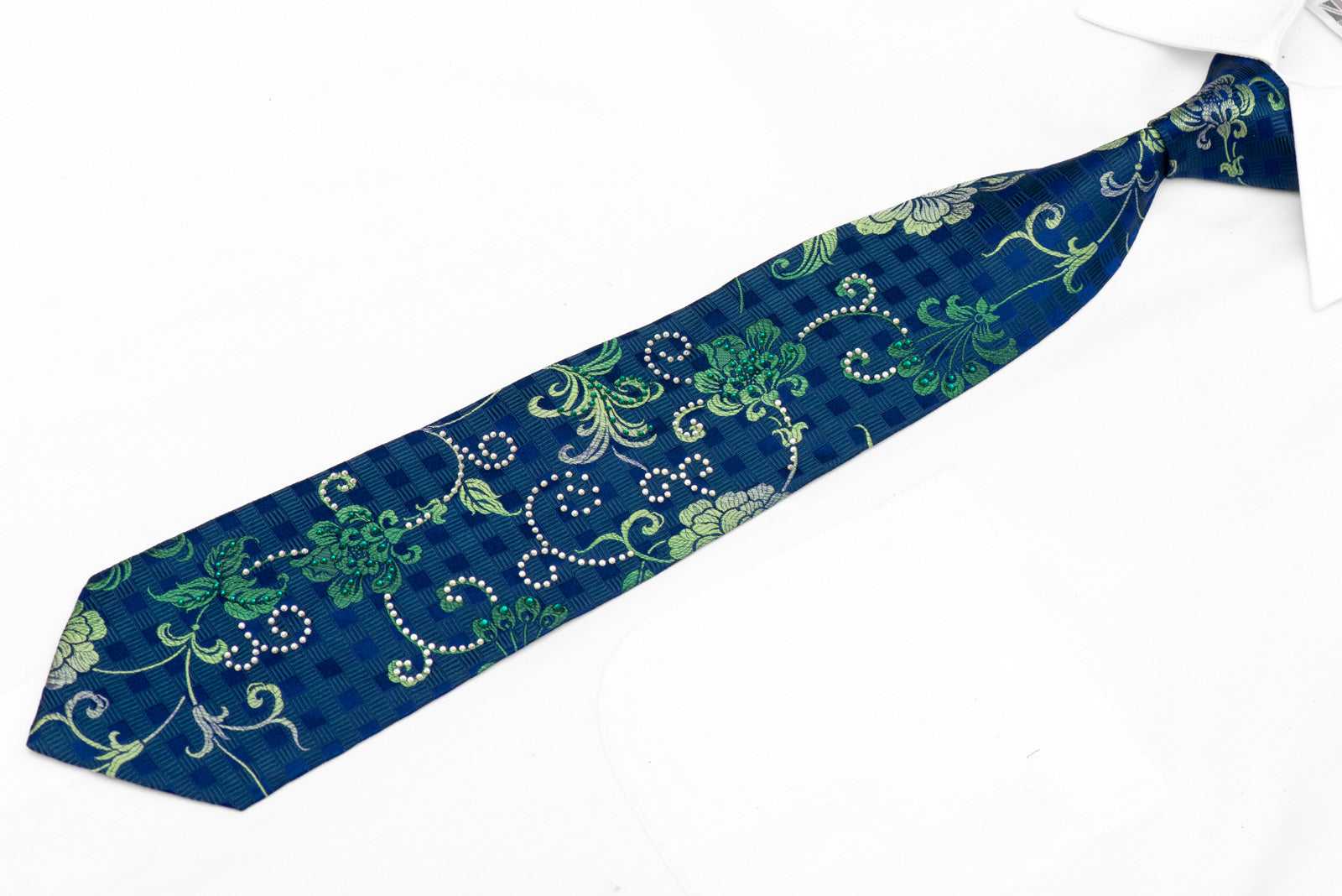 Make a bold statement with this captivating tie that brings together a striking blue canvas with lush green and silver floral designs. Adorned with sparkling rhinestones and shimmering silver details, this piece gives you the confidence to shine at any occasion. Whether you're attending a celebration or want to express your personal style, this tie empowers you to look your absolute best while feeling genuinely proud of your choice.