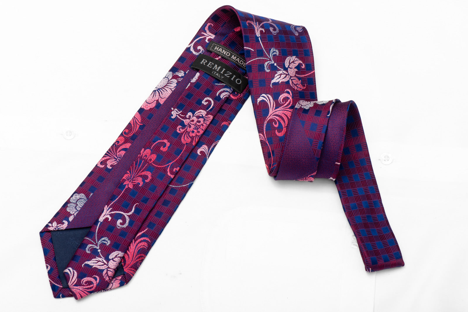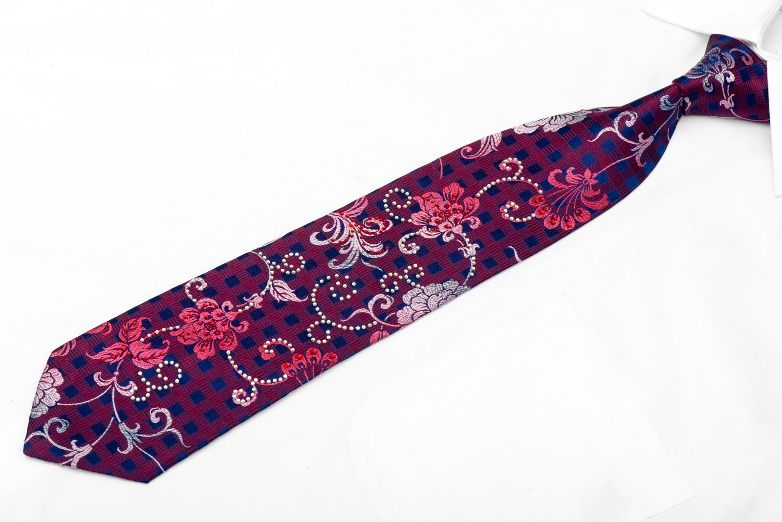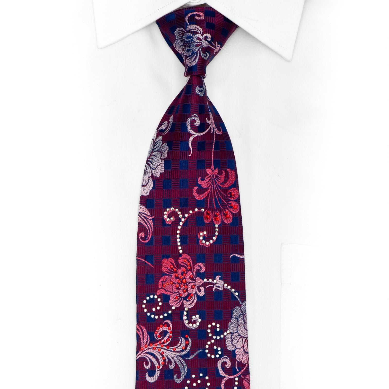 This striking tie combines classic checker and floral patterns in rich maroon and navy tones, elevated with sparkling rhinestone accents. Perfect for adding sophistication and personality to your formal or semi-formal wardrobe, this piece brings together timeless style with eye-catching detail. Whether you're dressing up for a special occasion or making a statement at work, this versatile tie helps you express your unique sense of style with confidence.
