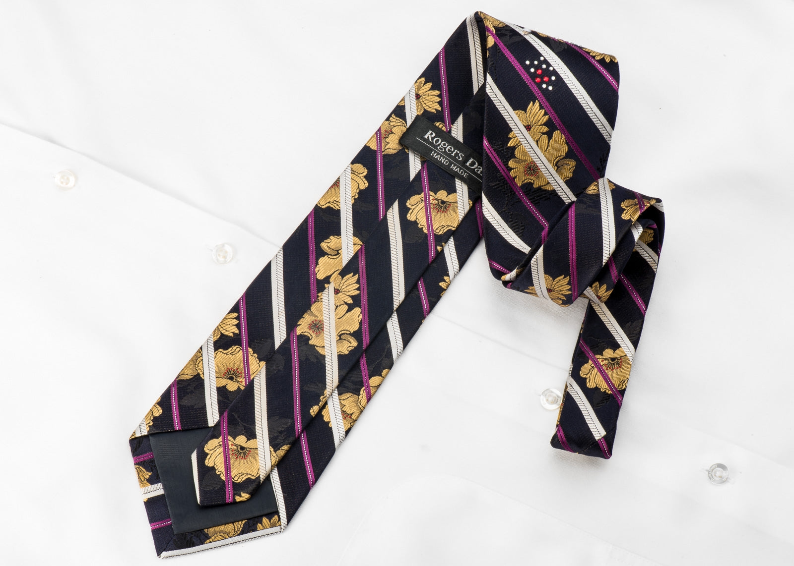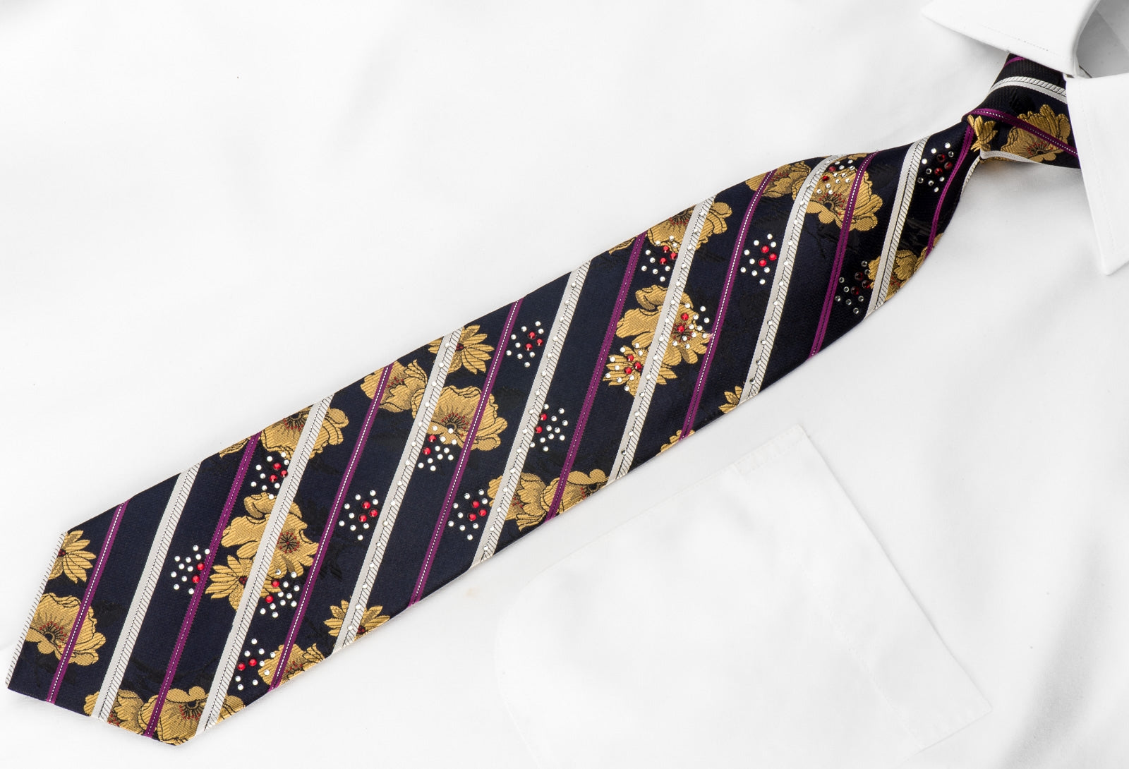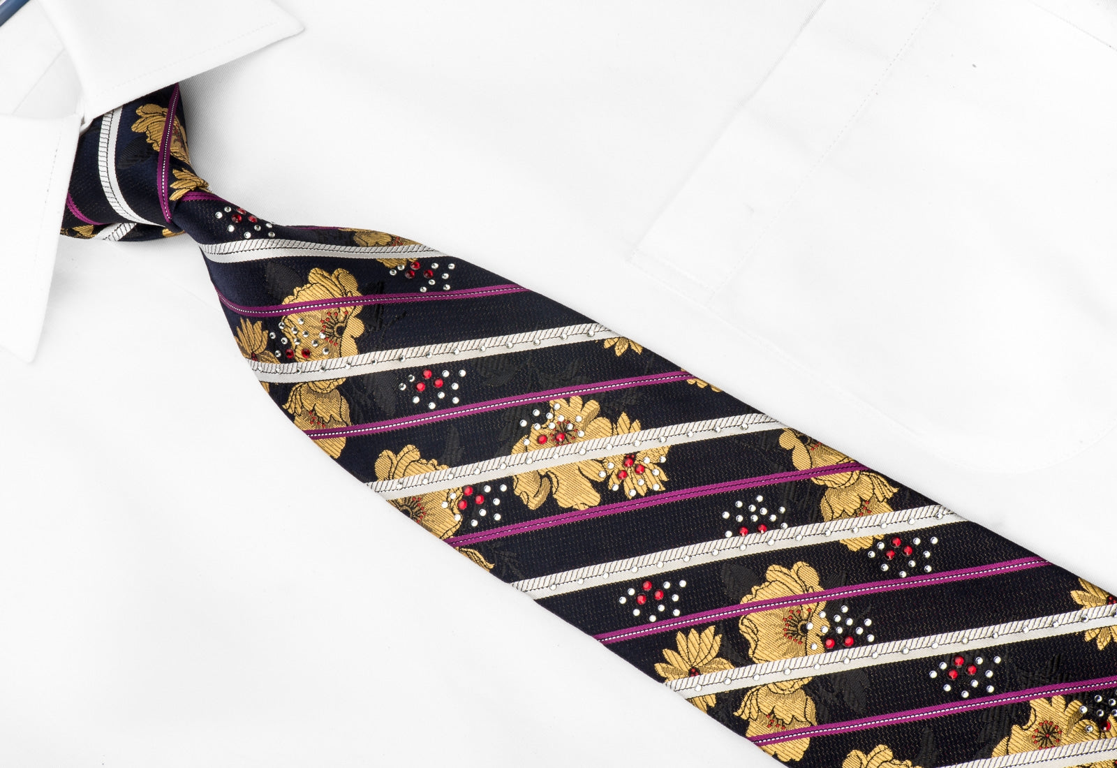 Stilvolle Kristallkrawatte für Herren, perfekt für jeden Anlass, handgefertigt und entworfen von der Top-Marke Rogers Dail. Präsentiert ein elegantes gelbes Blumen- und Silberrosa-Streifendesign auf marineblauer gewebter Seide, verziert mit roten, weißen Kristall-Strasssteinen und silbernen Glitzern.