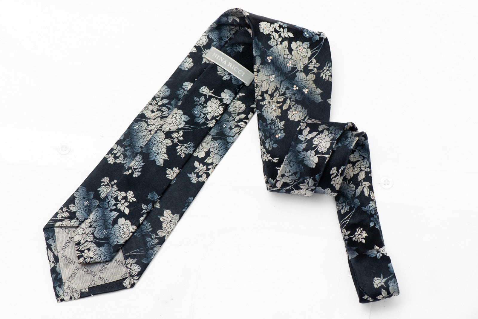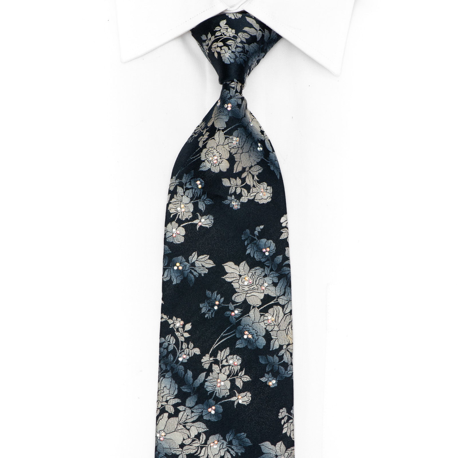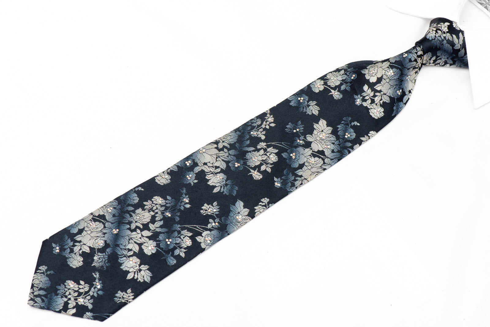 Elevate your formal wardrobe with this stunning silk necktie featuring an elegant silver floral design set against a rich navy blue backdrop. Adorned with shimmering rhinestones and silver sparkles throughout, this tie brings sophisticated glamour to any occasion. The luxurious silk fabric drapes beautifully while the intricate embellishments catch the light, making it a standout accessory for weddings, galas, or special events. Perfect for those who appreciate refined details and want to make a memorable impression.