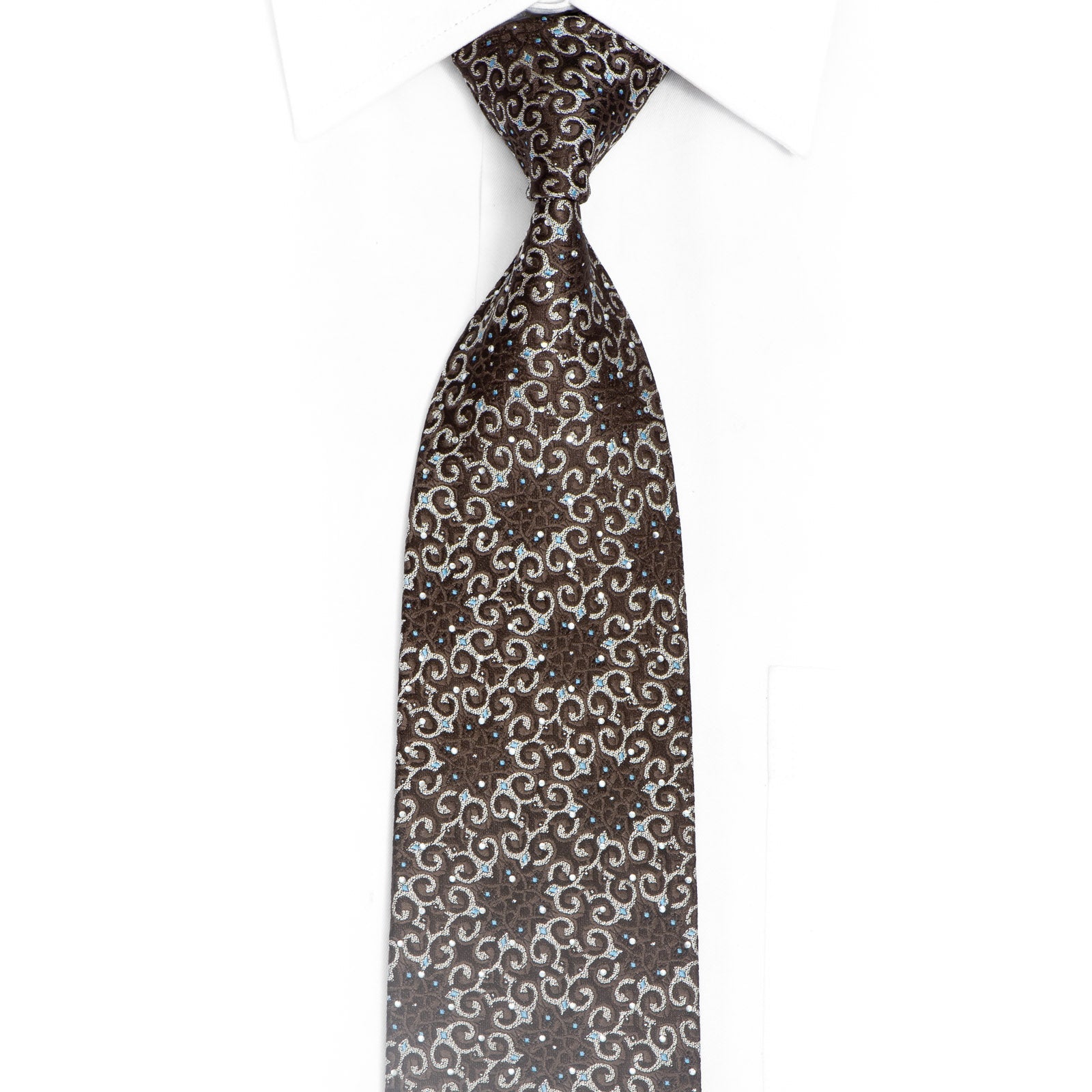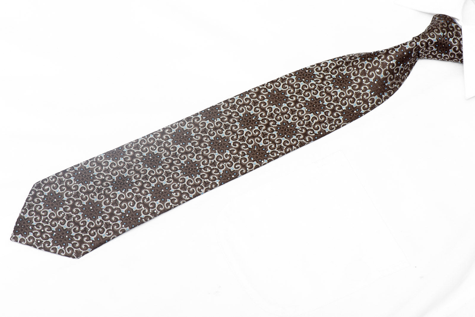 Add a touch of elegance and glamour to your wardrobe with our Silver Marrakesh Design On Brown Rhinestone Silk Tie With Sparkles. Perfect for any occasion, this tie is sure to make a statement and elevate your style game.