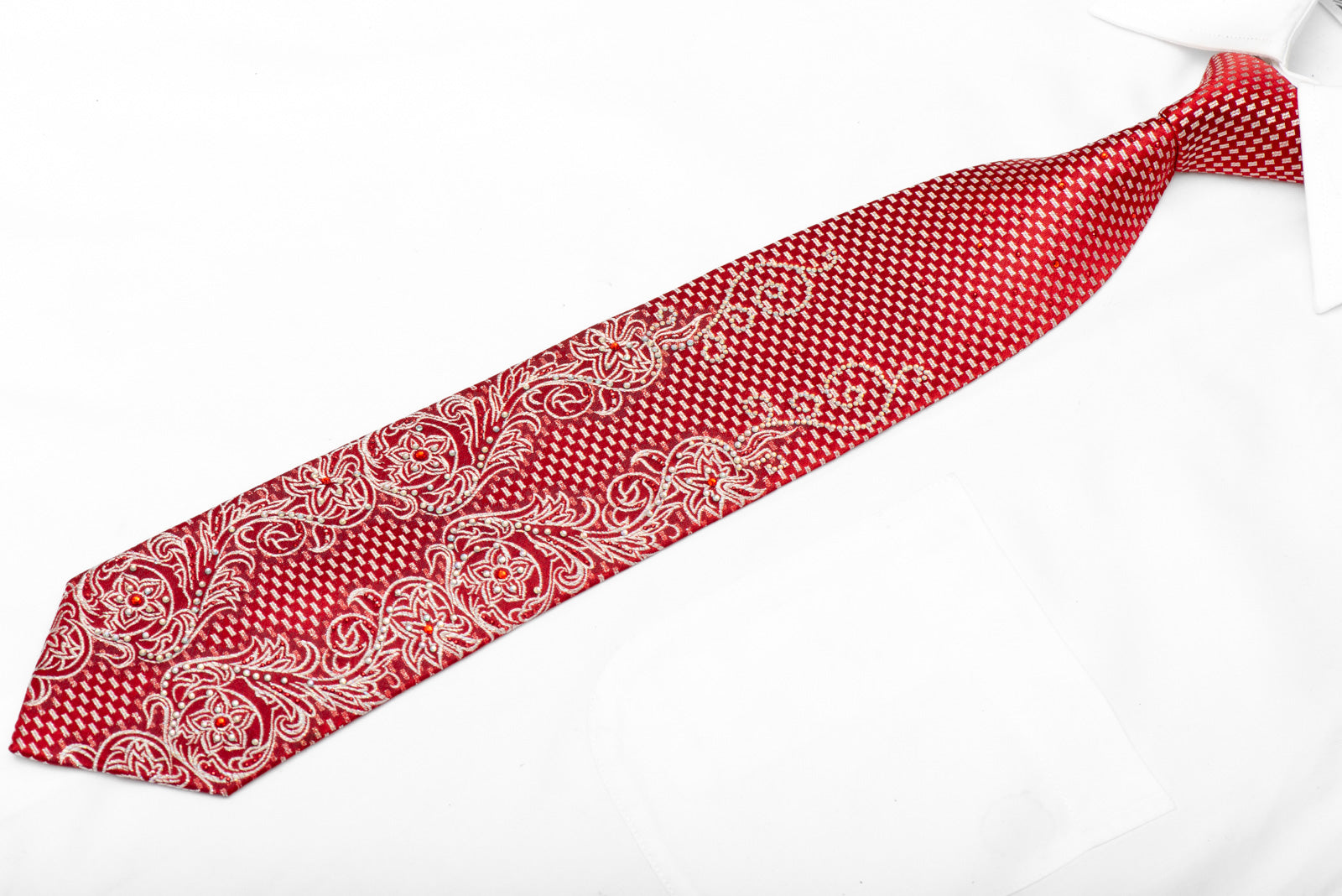 Elevate your formal wardrobe with this striking silk tie featuring an elegant silver scroll design set against a rich red backdrop. Adorned with shimmering rhinestones and silver sparkles throughout, this accessory brings sophisticated glamour to any occasion. The luxurious silk construction ensures a smooth drape and comfortable wear, while the eye-catching embellishments make it a standout piece for weddings, galas, or special events. Perfect for those who appreciate refined style with a touch of dazzle.