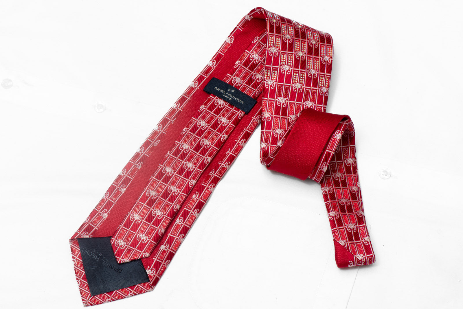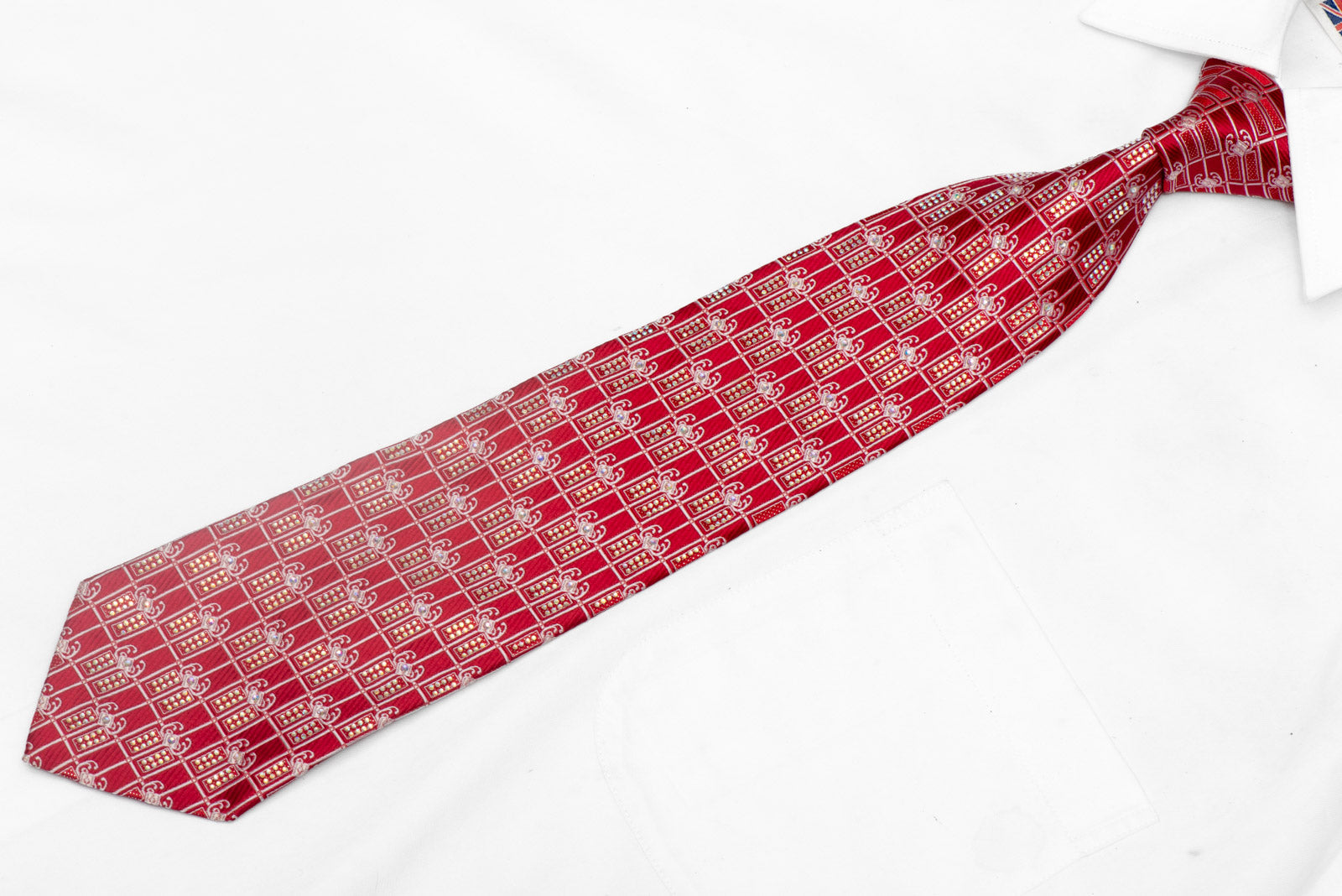 This stunning necktie features a Silver Trellis and Cartouche design on luxurious Red Rhinestone Silk, adding a touch of sparkle to any outfit.