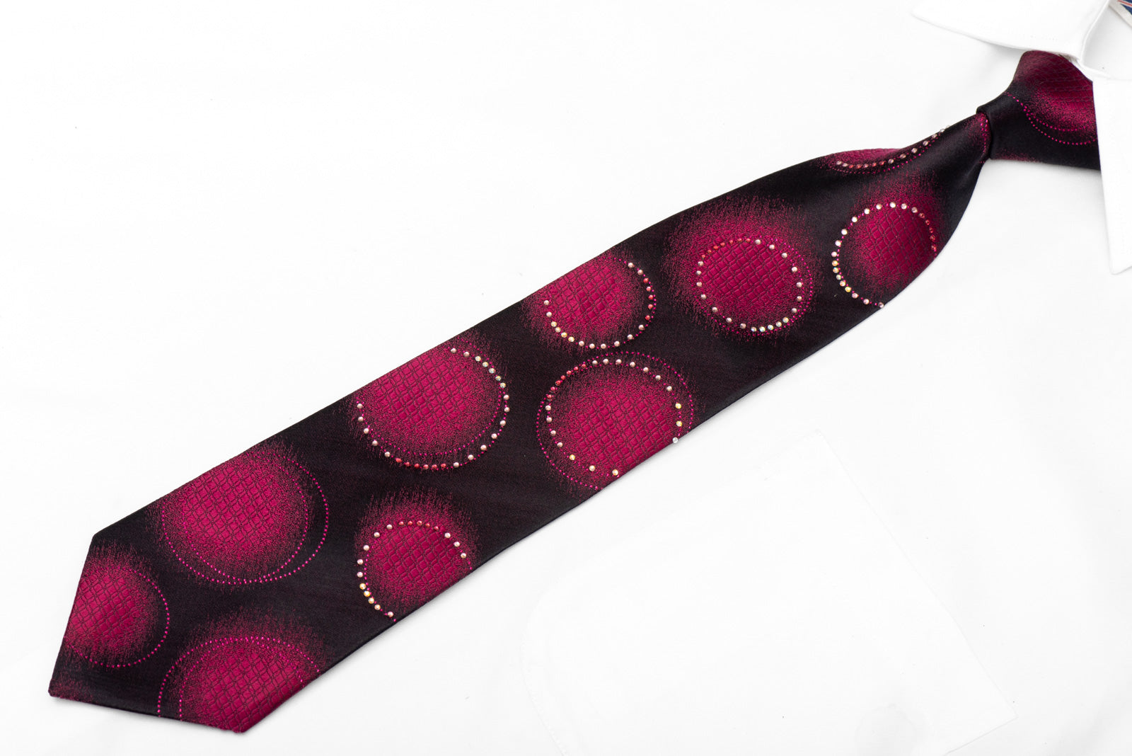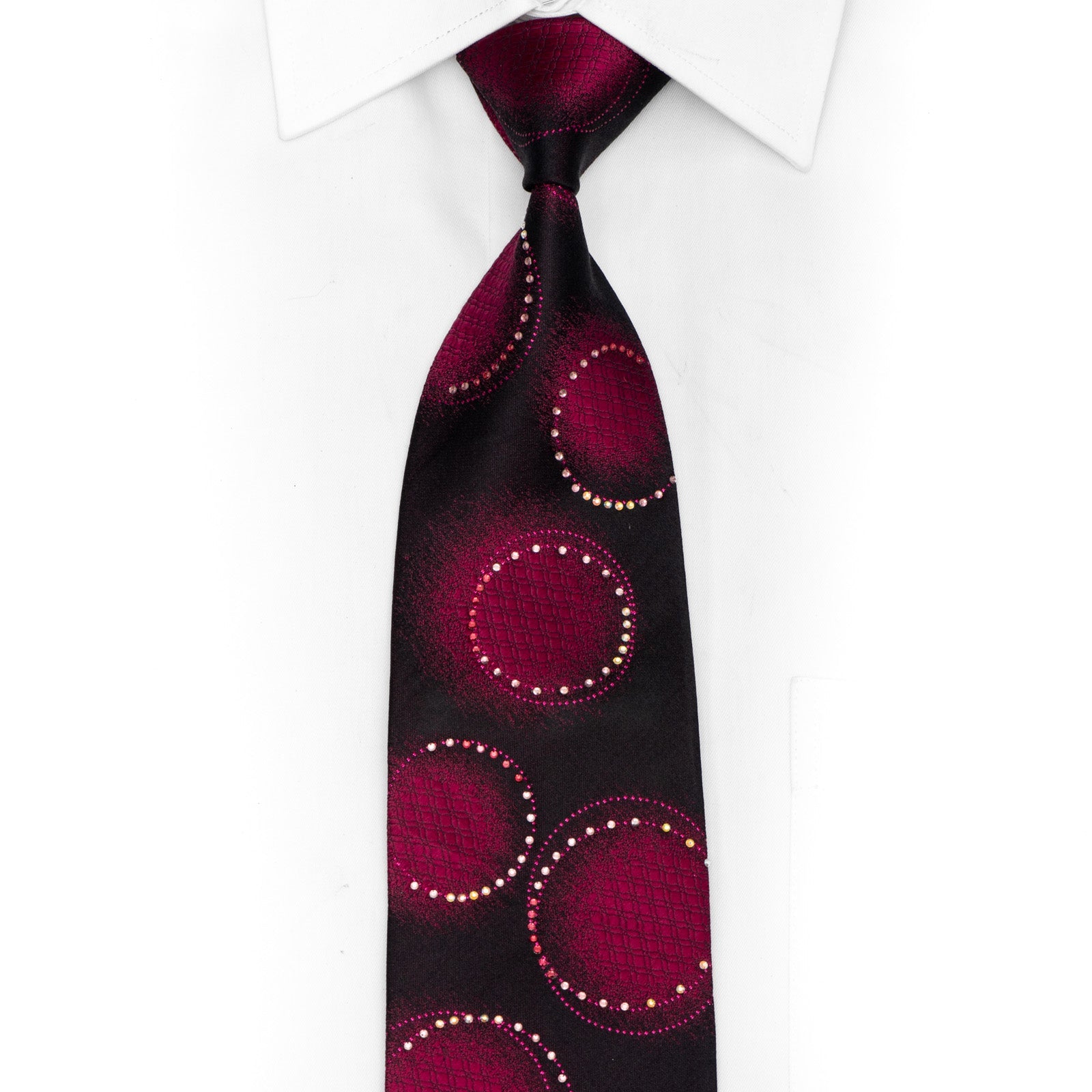 Elevate your formal wardrobe with this striking silk tie featuring a captivating violet geometric pattern set against a sophisticated black background. Adorned with shimmering rhinestones and sparkles, this accessory brings an elegant touch of glamour to any occasion. The luxurious silk construction ensures a refined drape and comfortable wear, making it perfect for weddings, galas, or upscale events where you want to make a memorable impression.